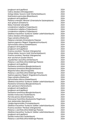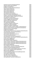 Sophora japonica 'Regent' (Pagodenschnurbaum) 2024 Celtis australis (Südlicher Zürgelbaum) 2024 Eucommina ulmoides (Guttaperchabaum) 2024 Sophora japonica (Schnurbaum) 2024 Styrax obassia (Obassia-Storaxbaum) 2024 Sophora japonica 'Regent' (Pagodenschnurbaum) 2024 Pinus peuce (Rumelische Kiefer) 2024 Pinus peuce (Rumelische Kiefer) 2024 Sorbus intermedia (Schwedische Mehlbeere) 2024 Pterocarya fraxinifolia (Kaukasische Flügelnuss) 2024 Clerodendrum trichotomun (Japanischer Losbaum) 2024 Clerodendrum trichotomun (Japanischer Losbaum) 2024 Pinus peuce (Rumelische Kiefer) 2024 Liquidambar styraciflua (Amberbaum) 2024 Pinus ponderosa (Gelbkiefer) 2024 Celtis australis (Südlicher Zürgelbaum) 2024 Amelanchier arborea 'Robin Hill' (Flaumige Felsenbirne) 2024 Picea abies 'Inversa' (Geisterfichte) 2024 Magnolia sprengeri 'Galaxy' (Großblumige-Magnolie) 2024 Magnolia denudata (Yulan-Magnolie) 2024 Chamaecyparis spec. (Scheinzypresse) 2024 Prunus avium (Vogelkirsche) 2024 Acer tataricum (Feuerahorn) 2024 Cedrus deodara (Himalajazeder) 2024 Platanus x acerifolia (Ahornblättrige Platane) 2024 Ulmus minor (Feldulme) 2024 Salix alba 'Tristis' (Trauerweide) 2024 Malus x purpurea (Zierapfel) 2024 Prunus padus (Traubenkirsche) 2024 Liquidambar styraciflua (Amberbaum) 2024 Eucommina ulmoides (Guttaperchabaum) 2024 Ostrya carpinifolia (Hopfenbuche) 2024 Quercus ilex (Stein-Eiche) 2024 Quercus frainetto (Ungarische Eiche) 2024 Fagus sylvatica (Rotbuche) 2024 Larix decidua (Europäische Lärche) 2024 Sophora japonica 'Regent' (Pagodenschnurbaum) 2024 Betula papyrifera (Papierbirke) 2024 Ulmus 'New Horizon' (Resista Ulme) 2024 Aesculus x carnea (Rotblühende Kastanie) 2024 Acer campestre 'Korinthosz' (Feldahorn) 2024 Acer campestre 'Korinthosz' (Feldahorn) 2024 Pyrus calleryana 'Chanticleer' (Zierbirne) 2024 Pyrus calleryana 'Chanticleer' (Zierbirne) 2024 Eucommina ulmoides (Guttaperchabaum) 2024 Acer campestre 'Elsrijk' (Feldahorn) 2024 Acer campestre 'Elsrijk' (Feldahorn) 2024 Acer campestre 'Elsrijk' (Feldahorn) 2024 Pyrus calleryana 'Chanticleer' (Zierbirne) 2024 Fraxinus ornus 'Obelisk' (Säulenblumenesche) 2024 Fraxinus ornus 'Obelisk' (Säulenblumenesche) 2024