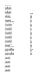 Alxingergasse Alxingergasse Alxingergasse Alxingergasse Alxingergasse Alxingergasse An der Hölle 1001/B Angeligasse 1003 Angeligasse 1004 Anningerweg 1006 Anningerweg 1007 Belgradplatz 1001 Carl-Prohaska-Platz 1001 Carl-Prohaska-Platz 1004 Columbusgasse 2001 Columbusplatz 1009 Columbusplatz 1010 Columbusplatz 1011 Columbusplatz 1013 Columbusplatz 1014 Columbusplatz 1016 Columbusplatz 1019 Columbusplatz 1020 Columbusplatz 1021 Columbusplatz 1022 Columbusplatz 1023 Columbusplatz 1024 Columbusplatz 1027 Columbusplatz 1028 Columbusplatz 1030 Davidgasse 1006 Doerenkampgasse 2010 Doerenkampgasse 2013 Eibesbrunnergasse 1081/A Eibesbrunnergasse 1082 Eibesbrunnergasse 1083 Eibesbrunnergasse 1084 Eibesbrunnergasse 1093 Erlachgasse Erlachgasse Erlachgasse Erlachgasse Erlachgasse Erlachgasse Erlachgasse Erlachgasse Erlachgasse Erlachgasse Erlachgasse Erlachgasse Erlachgasse