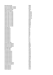 Montleartstraße 2069 Neulerchenfelder Straße 1006 Neulerchenfelder Straße 2012 Oberwiedenstraße 1050 Opfermanngasse 106 Ottakringer Straße 1023/A Ottakringer Straße 1023/B Ottakringer Straße 1037/A Ottakringer Straße 1037/B Ottakringer Straße 1037/C Ottakringer Straße 1037/H Ottakringer Straße 2036 Ottakringer Straße 2037 Ottakringer Straße 2038 Ottakringer Straße 2039 Ottakringer Straße 2040 Ottakringer Straße 2041 Paletzgasse 1001 Paltaufgasse 201 Paltaufgasse 202 Paltaufgasse 337 Paltaufgasse 338 Paltaufgasse 339 Paltaufgasse 340 Paltaufgasse 341 Paltaufgasse 411 Paltaufgasse 412 Paltaufgasse 413 Paltaufgasse 415 Pönningerweg 104 Redtenbachergasse 2001 Redtenbachergasse 2003 Redtenbachergasse 2004 Roseggergasse 109 Roterdstraße 1010 Roterdstraße 2002 Sandleitengasse 1024 Sandleitengasse 1043 Sandleitengasse 1044 Sandleitengasse 1045 Sandleitengasse 1048 Sandleitengasse 1079 Sandleitengasse 1085 Sandleitengasse 2021 Sandleitengasse 2026 Schellhammergasse 1003 Schellhammergasse 2003 Seeböckgasse 1002 Seeböckgasse 1009 Seeböckgasse 1010 Seeböckgasse 1013