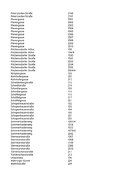 Peter-Jordan-Straße 2160 Peter-Jordan-Straße 2181 Plenergasse 2001 Plenergasse 2002 Plenergasse 2003 Plenergasse 2004 Plenergasse 2005 Plenergasse 2006 Plenergasse 2007 Plenergasse 2008 Plenergasse 2009 Plenergasse 2010 Pötzleinsdorfer Höhe 108 Pötzleinsdorfer Höhe 134/B Pötzleinsdorfer Straße 1030 Pötzleinsdorfer Straße 1041 Pötzleinsdorfer Straße 2032 Pötzleinsdorfer Straße 2034 Pötzleinsdorfer Straße 2035 Pötzleinsdorfer Straße 2064/A Rimplergasse 103 Ruhrhofergasse 202 Ruhrhofergasse 212 Scheibenbergstraße 115 Scheidlstraße 219 Schindlergasse 103 Schindlergasse 115 Schöffelgasse 115 Schöffelgasse 217 Schöffelgasse 221 Schopenhauerstraße 102 Schopenhauerstraße 103 Schopenhauerstraße 104 Schopenhauerstraße 105 Schopenhauerstraße 201 Schopenhauerstraße 202 Sommerhaidenweg 1001/A Sommerhaidenweg 1016 Sommerhaidenweg 1022 Sommerhaidenweg 1073/G Sommerhaidenweg 2042 Sternwartestraße 1007 Sternwartestraße 1068 Sternwartestraße 1109 Sternwartestraße 2006 Sternwartestraße 2023 Türkenschanzstraße 211 Türkenschanzstraße 213 Utopiaweg 106 Währinger Gürtel 220 Wallrißstraße 209