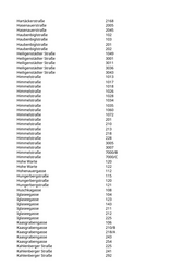 Hartäckerstraße 2168 Hasenauerstraße 2005 Hasenauerstraße 2045 Haubenbiglstraße 102 Haubenbiglstraße 103 Haubenbiglstraße 201 Haubenbiglstraße 202 Heiligenstädter Straße 1049 Heiligenstädter Straße 3001 Heiligenstädter Straße 3011 Heiligenstädter Straße 3036 Heiligenstädter Straße 3043 Himmelstraße 1013 Himmelstraße 1017 Himmelstraße 1018 Himmelstraße 1026 Himmelstraße 1028 Himmelstraße 1034 Himmelstraße 1035 Himmelstraße 1060 Himmelstraße 1072 Himmelstraße 201 Himmelstraße 210 Himmelstraße 213 Himmelstraße 218 Himmelstraße 228 Himmelstraße 3005 Himmelstraße 3007 Himmelstraße 7000/B Himmelstraße 7000/C Hohe Warte 120 Hohe Warte 122 Hohenauergasse 112 Hungerbergstraße 115 Hungerbergstraße 120 Hungerbergstraße 121 Huschkagasse 108 Iglaseegasse 104 Iglaseegasse 123 Iglaseegasse 143 Iglaseegasse 211 Iglaseegasse 212 Iglaseegasse 225 Kaasgrabengasse 106 Kaasgrabengasse 210/B Kaasgrabengasse 218/A Kaasgrabengasse 243 Kaasgrabengasse 254 Kahlenberger Straße 225 Kahlenberger Straße 241 Kahlenberger Straße 292
