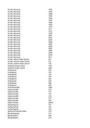 An der Neurisse 1002 An der Neurisse 1003 An der Neurisse 1004 An der Neurisse 1005 An der Neurisse 1006 An der Neurisse 1007 An der Neurisse 1008 An der Neurisse 1009 An der Neurisse 1010 An der Neurisse 1011 An der Neurisse 1012 An der Neurisse 1034 An der Neurisse 2001 An der Neurisse 2002 An der Neurisse 2003 An der Neurisse 2004 An der Neurisse 2005 An der Neurisse 2006 An der Neurisse 2007 An der Neurisse 2008 An der Neurisse 2009 An der Neurisse 2010 An der Neurisse 2011 An der oberen Alten Donau 201 An der unteren Alten Donau 127 An der unteren Alten Donau 130 Andreas-Huger-Gasse 1001 Andreas-Huger-Gasse 2001 Aribogasse 102 Aribogasse 103 Aribogasse 104 Aribogasse 105 Aribogasse 202 Aribogasse 203 Aribogasse 204 Aribogasse 205 Arminenstraße 2005 Aspernstraße 123 Aspernstraße 127 Aspernstraße 137 Aspernstraße 139 Aspernstraße 217 Aspernstraße 236 Aspernstraße 280/A Azaleengasse 101 Azaleengasse 102 Azaleengasse 103 Barbara-Prammer-Allee 210 Benatzkygasse 213 Bergengasse 208 Bergengasse 216