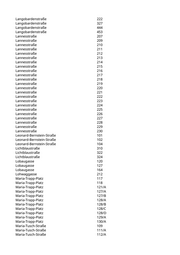 Langobardenstraße 222 Langobardenstraße 327 Langobardenstraße 444 Langobardenstraße 453 Lannesstraße 207 Lannesstraße 209 Lannesstraße 210 Lannesstraße 211 Lannesstraße 212 Lannesstraße 213 Lannesstraße 214 Lannesstraße 215 Lannesstraße 216 Lannesstraße 217 Lannesstraße 218 Lannesstraße 219 Lannesstraße 220 Lannesstraße 221 Lannesstraße 222 Lannesstraße 223 Lannesstraße 224 Lannesstraße 225 Lannesstraße 226 Lannesstraße 227 Lannesstraße 228 Lannesstraße 229 Lannesstraße 230 Leonard-Bernstein-Straße 101 Leonard-Bernstein-Straße 102 Leonard-Bernstein-Straße 104 Lichtblaustraße 310 Lichtblaustraße 322 Lichtblaustraße 324 Lobaugasse 120 Lobaugasse 127 Lobaugasse 164 Lohwaggasse 212 Maria-Trapp-Platz 117 Maria-Trapp-Platz 118 Maria-Trapp-Platz 121/A Maria-Trapp-Platz 127/A Maria-Trapp-Platz 127/B Maria-Trapp-Platz 128/A Maria-Trapp-Platz 128/B Maria-Trapp-Platz 128/C Maria-Trapp-Platz 128/D Maria-Trapp-Platz 129/A Maria-Trapp-Platz 130/A Maria-Tusch-Straße 109 Maria-Tusch-Straße 111/A Maria-Tusch-Straße 112/A
