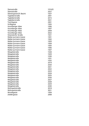 Slamastraße 1016/D Slamastraße 2027 Steinergasse/23. Bezirk 1027 Taglieberstraße 2001 Taglieberstraße 2015 Taglieberstraße 2021 Tuschlgasse 2001 Virilligasse 1005 Vorarlberger Allee 1006 Vorarlberger Allee 1007 Vorarlberger Allee 2004 Vorarlberger Allee 2022 Vösendorfer Straße 1021 Walter-Jurmann-Gasse 1001 Walter-Jurmann-Gasse 1002 Walter-Jurmann-Gasse 1003 Walter-Jurmann-Gasse 1004 Walter-Jurmann-Gasse 1005 Walter-Jurmann-Gasse 1006 Walter-Jurmann-Gasse 1007 Wiegelestraße 1028 Wiegelestraße 1029 Wiegelestraße 1030 Wiegelestraße 1031 Wiegelestraße 1032 Wiegelestraße 2019 Wiegelestraße 2020 Wiegelestraße 2021 Wiegelestraße 2022 Wiegelestraße 2023 Wiegelestraße 2024 Wiegelestraße 2025 Wiegelestraße 2026 Wiegelestraße 2027 Wiegelestraße 2028 Wiegelestraße 2029 Wiegelestraße 2030 Wohnparkstraße 3018 Wohnparkstraße 3021 Wundtgasse 1004 Ziedlergasse 2008