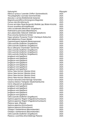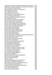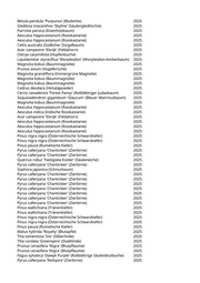 Gattung/Art Pflanzjahr Hibiscus syriacus 'Lavender Chiffon' (Garteneibisch) 2025 Tilia platyphyllos 'Laciniata' (Sommerlinde) 2025 Aesculus x carnea (Rotblühende Kastanie) 2025 Magnolia grandiflora (Immergrüne Magnolie) 2025 Cornus mas (Dirndlstrauch) 2025 Prunus serrulata 'Royal Burgundy' (Rotblät. Jap. Blüten-Kirsche) 2025 Prunus cerasifera (Kirschpflaume) 2025 Celtis occidentalis (Westlicher Zürgelbaum) 2025 Koelreuteria paniculata (Blasenbaum) 2025 Acer platanoides 'Deborah' (Hellroter Spitzahorn) 2025 Picea omorika (Serbische Fichte) 2025 Fagus sylvatica 'Purpurea Tricolor' (Harlequin-Rotbuche) 2025 Salix babylonica (Trauer-Weide) 2025 Cupressocyparis leylandii (Riesenzypresse) 2025 Celtis australis (Südlicher Zürgelbaum) 2025 Celtis australis (Südlicher Zürgelbaum) 2025 Pyrus calleryana 'Chanticleer' (Zierbirne) 2025 Celtis australis (Südlicher Zürgelbaum) 2025 Celtis australis (Südlicher Zürgelbaum) 2025 Celtis australis (Südlicher Zürgelbaum) 2025 Jungbaum wird gepflanzt 2025 Jungbaum wird gepflanzt 2025 Jungbaum wird gepflanzt 2025 Jungbaum wird gepflanzt 2025 Jungbaum wird gepflanzt 2025 Jungbaum wird gepflanzt 2025 Jungbaum wird gepflanzt 2025 Ulmus 'New Horizon' (Resista Ulme) 2025 Ulmus 'New Horizon' (Resista Ulme) 2025 Ulmus 'New Horizon' (Resista Ulme) 2025 Ulmus 'New Horizon' (Resista Ulme) 2025 Tamarix tetrandra (Viermännige Tamariske) 2025 Carpinus betulus 'Fastigiata' (Säulenhainbuche) 2025 Cercis siliquastrum (Judasbaum) 2025 Jungbaum wird gepflanzt 2025 Jungbaum wird gepflanzt 2025 Jungbaum wird gepflanzt 2025 Jungbaum wird gepflanzt 2025 Jungbaum wird gepflanzt 2025 Celtis australis (Südlicher Zürgelbaum) 2025 Sophora japonica 'Regent' (Pagodenschnurbaum) 2025 Sophora japonica 'Regent' (Pagodenschnurbaum) 2025 Platanus spec. (Platane) 2025 Sophora japonica (Schnurbaum) 2025 Sophora japonica (Schnurbaum) 2025 Chitalpa x tashkentensis (Baumoleander) 2025 Chitalpa x tashkentensis (Baumoleander) 2025 Celtis australis (Südlicher Zürgelbaum) 2025 Platanus x acerifolia (Ahornblättrige Platane) 2025