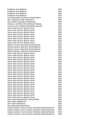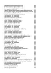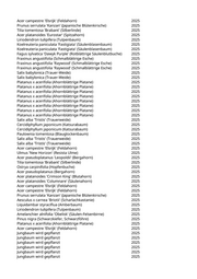 Paulownia tomentosa (Blauglockenbaum) 2025 Paulownia tomentosa (Blauglockenbaum) 2025 Paulownia tomentosa (Blauglockenbaum) 2025 Acer campestre (Feldahorn) 2025 Carpinus betulus 'Frans Fontaine' (Schlanke Säulenhainbuche) 2025 Aesculus hippocastanum 'Baumannii' (Gefülltblühende Kastanie) 2025 Liquidambar styraciflua (Amberbaum) 2025 Amelanchier ovalis (Gewöhnliche Felsenbirne) 2025 Tilia tomentosa 'Sisi' (Silberlinde) 2025 Tilia tomentosa 'Sisi' (Silberlinde) 2025 Celtis australis (Südlicher Zürgelbaum) 2025 Tilia tomentosa 'Sisi' (Silberlinde) 2025 Ulmus 'Columella' (Holländische Ulme) 2025 Ulmus 'Columella' (Holländische Ulme) 2025 Ulmus 'New Horizon' (Resista Ulme) 2025 Ulmus 'New Horizon' (Resista Ulme) 2025 Ulmus 'New Horizon' (Resista Ulme) 2025 Tilia tomentosa 'Sisi' (Silberlinde) 2025 Tilia tomentosa 'Sisi' (Silberlinde) 2025 Gleditsia triacanthos 'Skyline' (Säulengleditschie) 2025 Tilia tomentosa 'Sisi' (Silberlinde) 2025 Ulmus 'Columella' (Holländische Ulme) 2025 Ulmus 'Columella' (Holländische Ulme) 2025 Ulmus 'Columella' (Holländische Ulme) 2025 Sorbus aucuparia 'Sheerwater Seedling' (Säuleneberesche) 2025 Sorbus aucuparia 'Sheerwater Seedling' (Säuleneberesche) 2025 Fraxinus ornus 'Meczek' (Kugelblumenesche) 2025 Paulownia tomentosa (Blauglockenbaum) 2025 Prunus avium (Vogelkirsche) 2025 Prunus avium (Vogelkirsche) 2025 Tilia tomentosa 'Sisi' (Silberlinde) 2025 Populus spec. (Pappel) 2025 Quercus rubra (Roteiche) 2025 Tilia tomentosa 'Sisi' (Silberlinde) 2025 Paulownia tomentosa (Blauglockenbaum) 2025 Prunus avium 'Plena' (Gefülltblühende Vogelkirsche) 2025 Tilia tomentosa 'Sisi' (Silberlinde) 2025 Acer platanoides (Spitzahorn) 2025 Ulmus 'New Horizon' (Resista Ulme) 2025 Sophora japonica (Schnurbaum) 2025 Sophora japonica 'Regent' (Pagodenschnurbaum) 2025 Tilia mongolica (Mongolische Linde) 2025 Acer campestre 'Elsrijk' (Feldahorn) 2025 Corylus colurna (Baumhasel) 2025 Gleditsia triacanthos 'Inermis' (Dornenloser Lederhülsenbaum) 2025 Gleditsia triacanthos 'Inermis' (Dornenloser Lederhülsenbaum) 2025 Koelreuteria paniculata (Blasenbaum) 2025 Robinia pseudoacacia (Scheinakazie) 2025 Corylus colurna (Baumhasel) 2025 Aesculus flava (Gelbe Kastanie) 2025 Quercus robur (Stieleiche) 2025