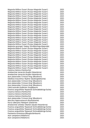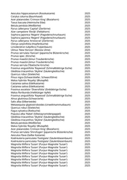 Aesculus hippocastanum (Rosskastanie) 2025 Corylus colurna (Baumhasel) 2025 Acer platanoides 'Crimson King' (Blutahorn) 2025 Taxus baccata (Heimische Eibe) 2025 Betula pendula (Weißbirke) 2025 Pyrus calleryana 'Capital' (Zierbirne) 2025 Acer campestre 'Elsrijk' (Feldahorn) 2025 Sophora japonica 'Regent' (Pagodenschnurbaum) 2025 Sophora japonica 'Regent' (Pagodenschnurbaum) 2025 Pyrus calleryana 'Aristocrat' (Zierbirne) 2025 Ostrya carpinifolia (Hopfenbuche) 2025 Liriodendron tulipifera (Tulpenbaum) 2025 Ulmus 'New Horizon' (Resista Ulme) 2025 Prunus serrulata 'Kanzan' (Japanische Blütenkirsche) 2025 Prunus spec. (Kirsche) 2025 Prunus maackii (Amur-Traubenkirsche) 2025 Prunus maackii (Amur-Traubenkirsche) 2025 Prunus serrula (Tibetische Kirsche) 2025 Fraxinus angustifolia 'Raywood' (Schmalblättrige Esche) 2025 Gleditsia triacanthos 'Skyline' (Säulengleditschie) 2025 Quercus robur (Stieleiche) 2025 Pinus nigra (Schwarzkiefer, Schwarzföhre) 2025 Malus hybrida 'Royalty' (Blutapfel) 2025 Castanea sativa (Edelkastanie) 2025 Castanea sativa (Edelkastanie) 2025 Fraxinus excelsior 'Diversifolia' (Einblättrige Esche) 2025 Malus floribunda (Vielblütiger Apfel) 2025 Fraxinus angustifolia 'Raywood' (Schmalblättrige Esche) 2025 Alnus glutinosa (Schwarzerle) 2025 Salix alba (Silberweide) 2025 Metasequoia glyptostroboides (Urweltmammutbaum) 2025 Quercus robur (Stieleiche) 2025 Fagus sylvatica (Rotbuche) 2025 Populus alba 'Raket' (Silberpyramidenpappel) 2025 Gleditsia triacanthos 'Skyline' (Säulengleditschie) 2025 Gleditsia triacanthos 'Skyline' (Säulengleditschie) 2025 Betula pendula (Weißbirke) 2025 Malus hybrida 'Royalty' (Blutapfel) 2025 Acer platanoides 'Crimson King' (Blutahorn) 2025 Prunus serrulata 'Shirofugen' (Japanische Blütenkirsche) 2025 Aesculus flava (Gelbe Kastanie) 2025 Koelreuteria paniculata 'Fastigiata' (Säulenblasenbaum) 2025 Koelreuteria paniculata 'Fastigiata' (Säulenblasenbaum) 2025 Magnolia liliiflora 'Susan' (Purpur-Magnolie 'Susan') 2025 Magnolia liliiflora 'Susan' (Purpur-Magnolie 'Susan') 2025 Magnolia liliiflora 'Susan' (Purpur-Magnolie 'Susan') 2025 Magnolia liliiflora 'Susan' (Purpur-Magnolie 'Susan') 2025 Magnolia liliiflora 'Susan' (Purpur-Magnolie 'Susan') 2025 Magnolia liliiflora 'Susan' (Purpur-Magnolie 'Susan') 2025 Magnolia liliiflora 'Susan' (Purpur-Magnolie 'Susan') 2025 Magnolia liliiflora 'Susan' (Purpur-Magnolie 'Susan') 2025