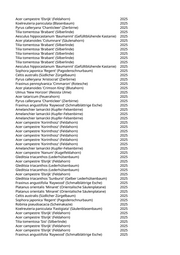 Acer campestre 'Elsrijk' (Feldahorn) 2025 Koelreuteria paniculata (Blasenbaum) 2025 Pyrus calleryana 'Chanticleer' (Zierbirne) 2025 Tilia tomentosa 'Brabant' (Silberlinde) 2025 Aesculus hippocastanum 'Baumannii' (Gefülltblühende Kastanie) 2025 Acer platanoides 'Columnare' (Säulenahorn) 2025 Tilia tomentosa 'Brabant' (Silberlinde) 2025 Tilia tomentosa 'Brabant' (Silberlinde) 2025 Tilia tomentosa 'Brabant' (Silberlinde) 2025 Tilia tomentosa 'Brabant' (Silberlinde) 2025 Tilia tomentosa 'Brabant' (Silberlinde) 2025 Aesculus hippocastanum 'Baumannii' (Gefülltblühende Kastanie) 2025 Sophora japonica 'Regent' (Pagodenschnurbaum) 2025 Celtis australis (Südlicher Zürgelbaum) 2025 Pyrus calleryana 'Aristocrat' (Zierbirne) 2025 Fraxinus pennsylvanica 'Cimmaron' (Rotesche) 2025 Acer platanoides 'Crimson King' (Blutahorn) 2025 Ulmus 'New Horizon' (Resista Ulme) 2025 Acer tataricum (Feuerahorn) 2025 Pyrus calleryana 'Chanticleer' (Zierbirne) 2025 Fraxinus angustifolia 'Raywood' (Schmalblättrige Esche) 2025 Amelanchier lamarckii (Kupfer-Felsenbirne) 2025 Amelanchier lamarckii (Kupfer-Felsenbirne) 2025 Amelanchier lamarckii (Kupfer-Felsenbirne) 2025 Acer campestre 'Korinthosz' (Feldahorn) 2025 Acer campestre 'Korinthosz' (Feldahorn) 2025 Acer campestre 'Korinthosz' (Feldahorn) 2025 Acer campestre 'Korinthosz' (Feldahorn) 2025 Acer campestre 'Korinthosz' (Feldahorn) 2025 Acer campestre 'Korinthosz' (Feldahorn) 2025 Amelanchier lamarckii (Kupfer-Felsenbirne) 2025 Acer campestre 'Nanum' (Kugelfeldahorn) 2025 Gleditsia triacanthos (Lederhülsenbaum) 2025 Acer campestre 'Elsrijk' (Feldahorn) 2025 Gleditsia triacanthos (Lederhülsenbaum) 2025 Gleditsia triacanthos (Lederhülsenbaum) 2025 Acer campestre 'Elsrijk' (Feldahorn) 2025 Gleditsia triacanthos 'Sunburst' (Gelber Lederhülsenbaum) 2025 Fraxinus angustifolia 'Raywood' (Schmalblättrige Esche) 2025 Platanus orientalis 'Minaret' (Orientalische Säulenplatane) 2025 Platanus orientalis 'Minaret' (Orientalische Säulenplatane) 2025 Celtis australis (Südlicher Zürgelbaum) 2025 Sophora japonica 'Regent' (Pagodenschnurbaum) 2025 Robinia pseudoacacia (Scheinakazie) 2025 Koelreuteria paniculata 'Fastigiata' (Säulenblasenbaum) 2025 Acer campestre 'Elsrijk' (Feldahorn) 2025 Acer campestre 'Elsrijk' (Feldahorn) 2025 Tilia tomentosa 'Sisi' (Silberlinde) 2025 Acer campestre 'Elsrijk' (Feldahorn) 2025 Acer campestre 'Elsrijk' (Feldahorn) 2025 Fraxinus angustifolia 'Raywood' (Schmalblättrige Esche) 2025
