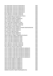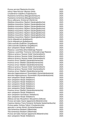 Acer platanoides 'Columnare' (Säulenahorn) 2025 Tilia tomentosa 'Brabant' (Silberlinde) 2025 Tilia tomentosa 'Brabant' (Silberlinde) 2025 Tilia tomentosa 'Brabant' (Silberlinde) 2025 Celtis australis (Südlicher Zürgelbaum) 2025 Tilia tomentosa 'Brabant' (Silberlinde) 2025 Prunus avium 'Plena' (Gefülltblühende Vogelkirsche) 2025 Prunus avium 'Plena' (Gefülltblühende Vogelkirsche) 2025 Fraxinus ornus 'Obelisk' (Säulenblumenesche) 2025 Fraxinus pennsylvanica 'Cimmaron' (Rotesche) 2025 Fraxinus ornus 'Obelisk' (Säulenblumenesche) 2025 Fraxinus ornus 'Obelisk' (Säulenblumenesche) 2025 Fraxinus ornus 'Obelisk' (Säulenblumenesche) 2025 Fraxinus ornus 'Obelisk' (Säulenblumenesche) 2025 Syringa vulgaris 'Alba' (Weißer Flieder) 2025 Syringa vulgaris 'Alba' (Weißer Flieder) 2025 Pyrus calleryana 'Chanticleer' (Zierbirne) 2025 Tilia tomentosa 'Brabant' (Silberlinde) 2025 Prunus avium 'Plena' (Gefülltblühende Vogelkirsche) 2025 Prunus avium (Vogelkirsche) 2025 Fraxinus ornus 'Obelisk' (Säulenblumenesche) 2025 Syringa vulgaris 'Alba' (Weißer Flieder) 2025 Syringa vulgaris 'Alba' (Weißer Flieder) 2025 Syringa vulgaris 'Alba' (Weißer Flieder) 2025 Syringa vulgaris 'Alba' (Weißer Flieder) 2025 Platanus x acerifolia 'Tremonia' (Schmalkronige Platane) 2025 Syringa vulgaris 'Alba' (Weißer Flieder) 2025 Ulmus 'New Horizon' (Resista Ulme) 2025 Ulmus 'New Horizon' (Resista Ulme) 2025 Ulmus 'New Horizon' (Resista Ulme) 2025 Ulmus 'New Horizon' (Resista Ulme) 2025 Ulmus 'New Horizon' (Resista Ulme) 2025 Ulmus 'New Horizon' (Resista Ulme) 2025 Ulmus 'New Horizon' (Resista Ulme) 2025 Ulmus 'New Horizon' (Resista Ulme) 2025 Ulmus 'New Horizon' (Resista Ulme) 2025 Ulmus 'New Horizon' (Resista Ulme) 2025 Ulmus 'New Horizon' (Resista Ulme) 2025 Syringa vulgaris 'Alba' (Weißer Flieder) 2025 Syringa vulgaris 'Alba' (Weißer Flieder) 2025 Syringa vulgaris 'Alba' (Weißer Flieder) 2025 Syringa vulgaris 'Alba' (Weißer Flieder) 2025 Syringa vulgaris 'Alba' (Weißer Flieder) 2025 Celtis australis (Südlicher Zürgelbaum) 2025 Pyrus calleryana 'Chanticleer' (Zierbirne) 2025 Acer campestre 'Elsrijk' (Feldahorn) 2025 Ulmus 'Regal' (Resista Ulme) 2025 Ulmus 'Regal' (Resista Ulme) 2025 Carpinus betulus 'Frans Fontaine' (Schlanke Säulenhainbuche) 2025 Acer campestre 'Elsrijk' (Feldahorn) 2025 Acer platanoides 'Columnare' (Säulenahorn) 2025
