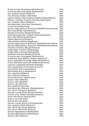 Prunus serrulata 'Amanogawa' (Säulenkirsche) 2025 Prunus serrulata 'Amanogawa' (Säulenkirsche) 2025 Acer campestre 'Elsrijk' (Feldahorn) 2025 Tilia tomentosa 'Brabant' (Silberlinde) 2025 Carpinus betulus 'Frans Fontaine' (Schlanke Säulenhainbuche) 2025 Platanus x acerifolia 'Tremonia' (Schmalkronige Platane) 2025 Acer campestre 'Elsrijk' (Feldahorn) 2025 Acer platanoides 'Columnare' (Säulenahorn) 2025 Corylus colurna (Baumhasel) 2025 Aesculus hippocastanum 'Baumannii' (Gefülltblühende Kastanie) 2025 Morus alba (Weißer Maulbeerbaum) 2025 Paulownia tomentosa (Blauglockenbaum) 2025 Koelreuteria paniculata 'Fastigiata' (Säulenblasenbaum) 2025 Morus alba (Weißer Maulbeerbaum) 2025 Sophora japonica (Schnurbaum) 2025 Celtis australis (Südlicher Zürgelbaum) 2025 Aesculus hippocastanum 'Baumannii' (Gefülltblühende Kastanie) 2025 Aesculus hippocastanum 'Baumannii' (Gefülltblühende Kastanie) 2025 Paulownia tomentosa (Blauglockenbaum) 2025 Ginkgo biloba 'Tremonia' (Säulenginkgo) 2025 Ginkgo biloba 'Tremonia' (Säulenginkgo) 2025 Paulownia tomentosa (Blauglockenbaum) 2025 Prunus serrulata 'Amanogawa' (Säulenkirsche) 2025 Amelanchier laevis 'Ballerina' (Essbare Felsenbirne) 2025 Prunus subhirtella 'Autumnalis' (Weiße Winterkirsche) 2025 Prunus subhirtella 'Autumnalis' (Weiße Winterkirsche) 2025 Laburnum anagyroides (Gemeiner Goldregen) 2025 Acer monspessulanum (Französischer Ahorn) 2025 Gymnocladus dioicus (Geweihbaum) 2025 Gymnocladus dioicus (Geweihbaum) 2025 Acer campestre (Feldahorn) 2025 Acer campestre (Feldahorn) 2025 Ulmus 'New Horizon' (Resista Ulme) 2025 Quercus robur (Stieleiche) 2025 Quercus robur (Stieleiche) 2025 Quercus rubra (Roteiche) 2025 Alnus spaethii (Purpur-Erle) 2025 Acer platanoides 'Globosum' (Kugelspitzahorn) 2025 Acer rubrum 'Red Sunset' (Rotahorn) 2025 Aesculus x carnea 'Briotii' (Scharlachkastanie) 2025 Fraxinus ornus 'Obelisk' (Säulenblumenesche) 2025 Ulmus 'New Horizon' (Resista Ulme) 2025 Quercus cerris (Zerreiche) 2025 Quercus cerris (Zerreiche) 2025 Aesculus x carnea 'Briotii' (Scharlachkastanie) 2025 Acer campestre 'Elsrijk' (Feldahorn) 2025 Acer rubrum 'Red Sunset' (Rotahorn) 2025 Acer rubrum 'Red Sunset' (Rotahorn) 2025 Aesculus hippocastanum (Rosskastanie) 2025 Aesculus hippocastanum (Rosskastanie) 2025 Quercus robur (Stieleiche) 2025
