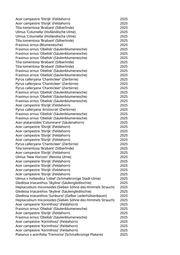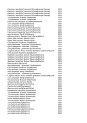 Platanus x acerifolia 'Tremonia' (Schmalkronige Platane) 2025 Platanus x acerifolia 'Tremonia' (Schmalkronige Platane) 2025 Platanus x acerifolia 'Tremonia' (Schmalkronige Platane) 2025 Platanus x acerifolia 'Tremonia' (Schmalkronige Platane) 2025 Tilia tomentosa 'Brabant' (Silberlinde) 2025 Tilia tomentosa 'Brabant' (Silberlinde) 2025 Fraxinus ornus 'Obelisk' (Säulenblumenesche) 2025 Acer campestre 'Elsrijk' (Feldahorn) 2025 Acer campestre 'Elsrijk' (Feldahorn) 2025 Fraxinus pennsylvanica 'Summit' (Rotesche) 2025 Fraxinus pennsylvanica 'Summit' (Rotesche) 2025 Fraxinus pennsylvanica 'Summit' (Rotesche) 2025 Acer campestre 'Elsrijk' (Feldahorn) 2025 Hibiscus syriacus 'Russian Violet' (Garteneibisch) 2025 Ulmus 'New Horizon' (Resista Ulme) 2025 Ulmus 'New Horizon' (Resista Ulme) 2025 Celtis australis (Südlicher Zürgelbaum) 2025 Acer platanoides 'Columnare' (Säulenahorn) 2025 Pyrus calleryana 'Chanticleer' (Zierbirne) 2025 Acer platanoides 'Columnare' (Säulenahorn) 2025 Carpinus betulus 'Frans Fontaine' (Schlanke Säulenhainbuche) 2025 Celtis australis (Südlicher Zürgelbaum) 2025 Gleditsia triacanthos 'Skyline' (Säulengleditschie) 2025 Gleditsia triacanthos 'Skyline' (Säulengleditschie) 2025 Gleditsia triacanthos 'Skyline' (Säulengleditschie) 2025 Gleditsia triacanthos 'Skyline' (Säulengleditschie) 2025 Quercus cerris (Zerreiche) 2025 Acer platanoides 'Columnare' (Säulenahorn) 2025 Celtis australis (Südlicher Zürgelbaum) 2025 Celtis australis (Südlicher Zürgelbaum) 2025 Acer campestre 'Elsrijk' (Feldahorn) 2025 Acer platanoides 'Columnare' (Säulenahorn) 2025 Carpinus betulus 'Frans Fontaine' (Schlanke Säulenhainbuche) 2025 Acer campestre 'Elsrijk' (Feldahorn) 2025 Tilia tomentosa 'Brabant' (Silberlinde) 2025 Salix pentandra (Lorbeer-Weide) 2025 Quercus coccinea (Scharlach-Eiche) 2025 Populus tremula (Zitterpappel) 2025 Quercus coccinea (Scharlach-Eiche) 2025 Liquidambar styraciflua (Amberbaum) 2025 Tilia tomentosa 'Brabant' (Silberlinde) 2025 Tilia x europaea 'Pallida' (Kaiserlinde) 2025 Tilia x europaea 'Pallida' (Kaiserlinde) 2025 Ulmus 'Rebella' (Resista-Ulme) 2025 Tilia x europaea 'Pallida' (Kaiserlinde) 2025 Acer platanoides (Spitzahorn) 2025 Acer platanoides (Spitzahorn) 2025 Acer platanoides (Spitzahorn) 2025 Fraxinus excelsior (Gemeine Esche) 2025 Acer platanoides (Spitzahorn) 2025 Acer platanoides (Spitzahorn) 2025