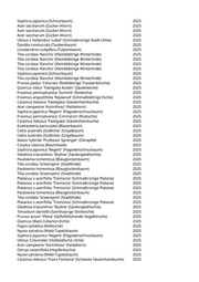 Sophora japonica (Schnurbaum) 2025 Acer saccharum (Zucker-Ahorn) 2025 Acer saccharum (Zucker-Ahorn) 2025 Acer saccharum (Zucker-Ahorn) 2025 Ulmus x hollandica 'Lobel' (Schmalkronige Stadt-Ulme) 2025 Davidia involucrata (Taubenbaum) 2025 Liriodendron tulipifera (Tulpenbaum) 2025 Tilia cordata 'Rancho' (Kleinblättrige Winterlinde) 2025 Tilia cordata 'Rancho' (Kleinblättrige Winterlinde) 2025 Tilia cordata 'Rancho' (Kleinblättrige Winterlinde) 2025 Tilia cordata 'Rancho' (Kleinblättrige Winterlinde) 2025 Sophora japonica (Schnurbaum) 2025 Tilia cordata 'Rancho' (Kleinblättrige Winterlinde) 2025 Prunus padus 'Colorata' (Rotblättrige Traubenkirsche) 2025 Quercus robur 'Fastigiata Koster' (Säuleneiche) 2025 Fraxinus pennsylvanica 'Summit' (Rotesche) 2025 Fraxinus angustifolia 'Raywood' (Schmalblättrige Esche) 2025 Carpinus betulus 'Fastigiata' (Säulenhainbuche) 2025 Acer campestre 'Korinthosz' (Feldahorn) 2025 Sophora japonica 'Regent' (Pagodenschnurbaum) 2025 Fraxinus pennsylvanica 'Cimmaron' (Rotesche) 2025 Carpinus betulus 'Fastigiata' (Säulenhainbuche) 2025 Koelreuteria paniculata (Blasenbaum) 2025 Celtis australis (Südlicher Zürgelbaum) 2025 Celtis australis (Südlicher Zürgelbaum) 2025 Malus hybride 'Professor Sprenger' (Zierapfel) 2025 Corylus colurna (Baumhasel) 2025 Sophora japonica 'Regent' (Pagodenschnurbaum) 2025 Gleditsia triacanthos 'Skyline' (Säulengleditschie) 2025 Paulownia tomentosa (Blauglockenbaum) 2025 Tilia cordata 'Greenspire' (Stadtlinde) 2025 Paulownia tomentosa (Blauglockenbaum) 2025 Tilia cordata 'Greenspire' (Stadtlinde) 2025 Platanus x acerifolia 'Tremonia' (Schmalkronige Platane) 2025 Platanus x acerifolia 'Tremonia' (Schmalkronige Platane) 2025 Platanus x acerifolia 'Tremonia' (Schmalkronige Platane) 2025 Paulownia tomentosa (Blauglockenbaum) 2025 Tilia cordata 'Greenspire' (Stadtlinde) 2025 Platanus x acerifolia 'Tremonia' (Schmalkronige Platane) 2025 Gleditsia triacanthos 'Skyline' (Säulengleditschie) 2025 Tetradium daniellii (Samthaarige Stinkesche) 2025 Prunus avium 'Plena' (Gefülltblühende Vogelkirsche) 2025 Quercus libani (Libanon-Eiche) 2025 Fagus sylvatica (Rotbuche) 2025 Nyssa sylvatica (Wald-Tupelobaum) 2025 Sophora japonica 'Regent' (Pagodenschnurbaum) 2025 Ulmus 'Columella' (Holländische Ulme) 2025 Acer campestre 'Korinthosz' (Feldahorn) 2025 Ostrya carpinifolia (Hopfenbuche) 2025 Nyssa sylvatica (Wald-Tupelobaum) 2025 Carpinus betulus 'Frans Fontaine' (Schlanke Säulenhainbuche) 2025