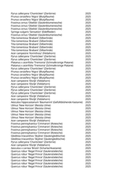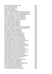 Malus floribunda (Vielblütiger Apfel) 2025 Acer campestre (Feldahorn) 2025 Prunus avium (Vogelkirsche) 2025 Prunus persica (Pfirsich) 2025 Sorbus domestica (Speierling) 2025 Platanus x acerifolia 'Tremonia' (Schmalkronige Platane) 2025 Platanus x acerifolia 'Tremonia' (Schmalkronige Platane) 2025 Platanus x acerifolia 'Tremonia' (Schmalkronige Platane) 2025 Fraxinus pennsylvanica 'Cimmaron' (Rotesche) 2025 Fraxinus pennsylvanica 'Cimmaron' (Rotesche) 2025 Fraxinus pennsylvanica 'Cimmaron' (Rotesche) 2025 Fraxinus pennsylvanica 'Cimmaron' (Rotesche) 2025 Acer campestre 'Elsrijk' (Feldahorn) 2025 Acer campestre 'Elsrijk' (Feldahorn) 2025 Acer campestre 'Elsrijk' (Feldahorn) 2025 Acer campestre 'Elsrijk' (Feldahorn) 2025 Acer campestre 'Elsrijk' (Feldahorn) 2025 Platanus x acerifolia 'Tremonia' (Schmalkronige Platane) 2025 Platanus x acerifolia 'Tremonia' (Schmalkronige Platane) 2025 Tilia tomentosa 'Brabant' (Silberlinde) 2025 Tilia tomentosa 'Brabant' (Silberlinde) 2025 Tilia tomentosa 'Brabant' (Silberlinde) 2025 Acer platanoides 'Columnare' (Säulenahorn) 2025 Acer platanoides 'Columnare' (Säulenahorn) 2025 Acer platanoides 'Columnare' (Säulenahorn) 2025 Acer platanoides 'Columnare' (Säulenahorn) 2025 Fraxinus pennsylvanica 'Cimmaron' (Rotesche) 2025 Fraxinus pennsylvanica 'Cimmaron' (Rotesche) 2025 Sophora japonica 'Columnaris' (Säulen-Schnurbaum) 2025 Acer platanoides 'Columnare' (Säulenahorn) 2025 Fraxinus pennsylvanica 'Cimmaron' (Rotesche) 2025 Sophora japonica 'Columnaris' (Säulen-Schnurbaum) 2025 Sophora japonica 'Columnaris' (Säulen-Schnurbaum) 2025 Acer platanoides 'Columnare' (Säulenahorn) 2025 Fraxinus pennsylvanica 'Cimmaron' (Rotesche) 2025 Sophora japonica 'Columnaris' (Säulen-Schnurbaum) 2025 Fraxinus pennsylvanica 'Cimmaron' (Rotesche) 2025 Sophora japonica 'Columnaris' (Säulen-Schnurbaum) 2025 Acer platanoides 'Columnare' (Säulenahorn) 2025 Fraxinus pennsylvanica 'Cimmaron' (Rotesche) 2025 Sophora japonica 'Columnaris' (Säulen-Schnurbaum) 2025 Acer platanoides 'Columnare' (Säulenahorn) 2025 Ulmus 'New Horizon' (Resista Ulme) 2025 Fraxinus pennsylvanica 'Cimmaron' (Rotesche) 2025 Tilia tomentosa 'Brabant' (Silberlinde) 2025 Tilia tomentosa 'Brabant' (Silberlinde) 2025 Prunus serrulata 'Asano' (Japanische Blütenkirsche) 2025 Tilia tomentosa 'Brabant' (Silberlinde) 2025 Pyrus calleryana 'Chanticleer' (Zierbirne) 2025 Tilia tomentosa 'Brabant' (Silberlinde) 2025 Acer platanoides 'Columnare' (Säulenahorn) 2025