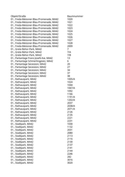 Objekt/Straße Baumnummer 01., Freda-Meissner-Blau-Promenade, MA42 1020 01., Freda-Meissner-Blau-Promenade, MA42 1021 01., Freda-Meissner-Blau-Promenade, MA42 1022 01., Freda-Meissner-Blau-Promenade, MA42 1023 01., Freda-Meissner-Blau-Promenade, MA42 1024 01., Freda-Meissner-Blau-Promenade, MA42 1025 01., Freda-Meissner-Blau-Promenade, MA42 1026 01., Freda-Meissner-Blau-Promenade, MA42 1027 01., Freda-Meissner-Blau-Promenade, MA42 1028 01., Freda-Meissner-Blau-Promenade, MA42 2009 01., Grete-Rehor-Park, MA42 7 01., Grete-Rehor-Park, MA42 7/A 01., Grete-Rehor-Park, MA42 7/B 01., Parkanlage Franz-Josefs-Kai, MA42 13 01., Parkanlage Schmerlingplatz, MA42 6 01., Parkanlage Secession, MA42 20 01., Parkanlage Secession, MA42 27 01., Parkanlage Secession, MA42 34 01., Parkanlage Secession, MA42 37 01., Parkanlage Secession, MA42 38 01., Rathauspark, MA42 1005/A 01., Rathauspark, MA42 1024 01., Rathauspark, MA42 1044 01., Rathauspark, MA42 1067/A 01., Rathauspark, MA42 1092 01., Rathauspark, MA42 1166 01., Rathauspark, MA42 1191/A 01., Rathauspark, MA42 1202/A 01., Rathauspark, MA42 2037 01., Rathauspark, MA42 2038/A 01., Rathauspark, MA42 2071/A 01., Rathauspark, MA42 2126 01., Rathauspark, MA42 2135 01., Rathauspark, MA42 2221 01., Rathauspark, MA42 2231 01., Stadtpark, MA42 1030 01., Stadtpark, MA42 1132 01., Stadtpark, MA42 2031 01., Stadtpark, MA42 2080 01., Stadtpark, MA42 2113 01., Stadtpark, MA42 2116 01., Stadtpark, MA42 2130 01., Stadtpark, MA42 2137 01., Stadtpark, MA42 2141 01., Stadtpark, MA42 2144 01., Stadtpark, MA42 2246 01., Stadtpark, MA42 282 01., Stadtpark, MA42 3016 01., Stadtpark, MA42 3020