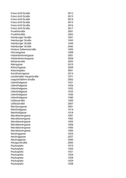 Franz-Grill-Straße 3012 Franz-Grill-Straße 3013 Franz-Grill-Straße 3014 Franz-Grill-Straße 3015 Franz-Grill-Straße 3016 Franz-Grill-Straße 3017 Fruethstraße 2001 Fruethstraße 2002 Hainburger Straße 1001 Hainburger Straße 1043 Hainburger Straße 1044 Hainburger Straße 2042 Hintere Zollamtsstraße 1003 Hörnesgasse 1008 Hüttenbrennergasse 2001 Hüttenbrennergasse 2004 Kelsenstraße 2002 Kleingasse 2010 Klimschgasse 2009 Kolonitzplatz 3001 Kundmanngasse 2013 Landstraßer Hauptstraße 1071 Leopold-Böhm-Straße 2002 Lilienthalgasse 1021 Lilienthalgasse 1026 Lilienthalgasse 1032 Lilienthalgasse 1033 Lilienthalgasse 1036 Lilienthalgasse 1040 Litfassstraße 1009 Litfassstraße 2007 Marilaungasse 2001 Markhofgasse 1014 Markhofgasse 1018 Marokkanergasse 1001 Marokkanergasse 1002 Marokkanergasse 1003 Marokkanergasse 1004 Marokkanergasse 1005 Marokkanergasse 1006 Neulinggasse 1053 Neulinggasse 2027 Neulinggasse 2046 Paragonstraße 2005 Paulusplatz 1010 Paulusplatz 1020 Paulusplatz 1021 Paulusplatz 1024 Paulusplatz 1028 Paulusplatz 1029 Paulusplatz 1038