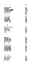Karl-Popper-Straße 1017/A Karplusgasse 1014 Kästenbaumgasse 1007 Kennergasse 2004 Klausenburger Straße 1009 Klausenburger Straße 1012/A Klederinger Straße 1007 Kornauthgasse 2012 Kundratstraße 2002 Kundratstraße 2042 Kundratstraße 4015 Kundratstraße 4021 Kundratstraße 4028 Kundratstraße 4043 Laaer-Berg-Straße 1014 Laaer-Berg-Straße 1015 Laaer-Berg-Straße 1083 Landgutgasse 2019 Landgutgasse 2029 Leopoldsdorfer Straße 2045 Leopoldsdorfer Straße 2060 Mundygasse 2001 Neilreichgasse 1003 Neilreichgasse 1007 Neilreichgasse 1030 Neilreichgasse 2046 Neilreichgasse 2063 Neilreichgasse 2093 Neugrabenstraße 2031 Neusetzgasse 1005 Ober-Laaer Platz 1002 Oberlaaer Straße 1018 Oberlaaer Straße 1062 Oberlaaer Straße 1069 Oberlaaer Straße 1074 Oberlaaer Straße 1080 Oberlaaer Straße 1085 Oberlaaer Straße 2003 Oberlaaer Straße 2024 Oberlaaer Straße 2027 Otto-Probst-Straße 1002 Otto-Probst-Straße 1003 Otto-Probst-Straße 1008 Otto-Probst-Straße 1060 Otto-Probst-Straße 1067 Otto-Probst-Straße 2059 Otto-Probst-Straße 2090 Otto-Probst-Straße 2093 Quellenstraße 1045 Quellenstraße 2010/A Quellenstraße 2012
