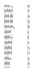 Bahnstraße 2006 Baumgartner Höhe 1003 Baumgartner Höhe 1004 Baumgartner Höhe 1009 Baumgartner Höhe 1016 Beckmanngasse 104 Bierhäuselberggasse 119 Breitenseer Straße 1011 Breitenseer Straße 1013 Breitenseer Straße 1044 Breitenseer Straße 1067 Breitenseer Straße 1110 Breitenseer Straße 2015 Breitenseer Straße 2021 Breitenseer Straße 2023 Breitenseer Straße 2029 Breitenseer Straße 3001 Breitenseer Straße 4009 Christine-Enghaus-Weg 1001 Christine-Enghaus-Weg 1021 Drechslergasse 111 Drechslergasse 201 Drechslergasse 205 Fenzlgasse 1006 Ferdinand-Frey-Weg 101 Flötzersteig 208 Freyenthurmgasse 103 Goldschlagstraße 190 Goldschlagstraße 193 Goldschlagstraße 194 Goldschlagstraße 195 Goldschlagstraße 196 Goldschlagstraße 2101 Goldschlagstraße 2111 Goldschlagstraße 2133 Goldschlagstraße 2134 Goldschlagstraße 2135 Goldschlagstraße 2136 Goldschlagstraße 2137 Goldschlagstraße 2138 Grassigasse 101 Gurkgasse 101 Gurkgasse 102 Gusterergasse 2001 Hackinger Straße 2001 Hauptstraße 1019 Hauptstraße 1020 Hauptstraße 2032 Hauptstraße 2078 Hauptstraße 2079 Hauptstraße 2087
