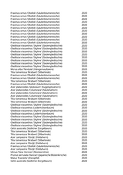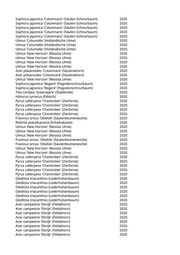 Amelanchier lamarckii (Kupfer-Felsenbirne) 2020 Celtis australis (Südlicher Zürgelbaum) 2020 Tilia cordata 'Greenspire' (Stadtlinde) 2020 Tilia cordata 'Greenspire' (Stadtlinde) 2020 Fraxinus ornus 'Obelisk' (Säulenblumenesche) 2020 Liriodendron tulipifera 'Arnold' (Säulentulpenbaum) 2020 Liriodendron tulipifera 'Arnold' (Säulentulpenbaum) 2020 Liriodendron tulipifera 'Arnold' (Säulentulpenbaum) 2020 Fraxinus pennsylvanica (Rotesche) 2020 Fraxinus ornus 'Obelisk' (Säulenblumenesche) 2020 Pyrus calleryana 'Chanticleer' (Zierbirne) 2020 Pyrus calleryana 'Chanticleer' (Zierbirne) 2020 Pyrus calleryana 'Chanticleer' (Zierbirne) 2020 Pyrus calleryana 'Chanticleer' (Zierbirne) 2020 Acer platanoides 'Globosum' (Kugelspitzahorn) 2020 Acer platanoides 'Columnare' (Säulenahorn) 2020 Betula utilis var. utilis (Himalaya-Birke) 2020 Ginkgo biloba 'Fastigiata Blagon' (Säulenfächerblattbaum) 2020 Acer x freemanii (Rot-Ahorn) 2020 Fagus sylvatica 'Atropurpurea' (Blutbuche) 2020 Catalpa bignonioides (Trompetenbaum) 2020 Paulownia tomentosa (Blauglockenbaum) 2020 Prunus serrulata 'Amanogawa' (Säulenkirsche) 2020 Acer truncatum 'Norwegian Sunset' (Ahorn 'Norwegian Sunset') 2020 Acer pensylvanicum (Streifen-Ahorn) 2020 Fagus sylvatica 'Atropunicea' (Sämlings Blutbuche) 2020 Quercus robur (Stieleiche) 2020 Davidia involucrata (Taubenbaum) 2020 Acer platanoides 'Farlakes Green' (Spitzahorn) 2020 Liriodendron tulipifera (Tulpenbaum) 2020 Liriodendron tulipifera (Tulpenbaum) 2020 Corylus colurna (Baumhasel) 2020 Gleditsia triacanthos 'Inermis' (Dornenloser Lederhülsenbaum) 2020 Acer x freemanii 'Armstrong' (Freemanii-Ahorn) 2020 Fraxinus angustifolia 'Raywood' (Schmalblättrige Esche) 2020 Fraxinus angustifolia 'Raywood' (Schmalblättrige Esche) 2020 Fraxinus angustifolia 'Raywood' (Schmalblättrige Esche) 2020 Fraxinus angustifolia 'Raywood' (Schmalblättrige Esche) 2020 Fraxinus angustifolia 'Raywood' (Schmalblättrige Esche) 2020 Fraxinus angustifolia 'Raywood' (Schmalblättrige Esche) 2020 Ulmus 'New Horizon' (Resista Ulme) 2020 Ulmus 'New Horizon' (Resista Ulme) 2020 Robinia pseudoacacia 'Pyramidalis' (Säulenakazie) 2020 Pyrus calleryana 'Chanticleer' (Zierbirne) 2020 Pyrus calleryana 'Chanticleer' (Zierbirne) 2020 Pyrus calleryana 'Chanticleer' (Zierbirne) 2020 Aesculus x carnea (Rotblühende Kastanie) 2020 Fraxinus angustifolia 'Raywood' (Schmalblättrige Esche) 2020 Acer platanoides 'Royal Red' (Roter Spitzahorn 'Royal Red') 2020 Acer platanoides 'Crimson King' (Blutahorn) 2020 Carpinus betulus 'Fastigiata' (Säulenhainbuche) 2020