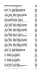 Prunus avium 'Plena' (Gefülltblühende Vogelkirsche) 2020 Platanus x acerifolia 'Tremonia' (Schmalkronige Platane) 2020 Tilia x euchlora (Krimlinde) 2020 Juglans nigra (Schwarznussbaum) 2020 Fraxinus excelsior 'Altena' (Gemeine Esche) 2020 Acer platanoides (Spitzahorn) 2020 Cladrastis lutea (Gelbholz) 2020 Acer campestre 'Elsrijk' (Feldahorn) 2020 Salix alba 'Tristis' (Trauerweide) 2020 Aesculus x carnea (Rotblühende Kastanie) 2020 Malus spec. (Apfelbaum) 2020 Cladrastis lutea (Gelbholz) 2020 Sophora japonica (Schnurbaum) 2020 Prunus serrulata 'Amanogawa' (Säulenkirsche) 2020 Acer truncatum 'Pacific Sunset' (Pazifischer Ahorn) 2020 Liriodendron tulipifera (Tulpenbaum) 2020 Acer truncatum 'Pacific Sunset' (Pazifischer Ahorn) 2020 Fagus sylvatica 'Atropurpurea' (Blutbuche) 2020 Fagus sylvatica (Rotbuche) 2020 Pinus nigra (Schwarzkiefer, Schwarzföhre) 2020 Pinus nigra (Schwarzkiefer, Schwarzföhre) 2020 Fagus sylvatica 'Atropunicea' (Sämlings Blutbuche) 2020 Acer pseudoplatanus 'Leopoldii' (Bergahorn) 2020 Acer platanoides 'Crimson King' (Blutahorn) 2020 Acer truncatum 'Pacific Sunset' (Pazifischer Ahorn) 2020 Koelreuteria paniculata (Blasenbaum) 2020 Pinus nigra (Schwarzkiefer, Schwarzföhre) 2020 Prunus cerasifera 'Nigra' (Blutpflaume) 2020 Robinia pseudoacacia 'Frisia' (Goldakazie) 2020 Malus spec. (Apfelbaum) 2020 Koelreuteria paniculata (Blasenbaum) 2020 Quercus robur (Stieleiche) 2020 Fagus sylvatica 'Dawyk' (Säulenrotbuche) 2020 Cercis siliquastrum (Judasbaum) 2020 Salix matsudana 'Tortuosa' (Korkenzieherweide) 2020 Prunus serrulata 'Kanzan' (Japanische Blütenkirsche) 2020 Acer campestre 'Green Column' (Säulen-Feldahorn) 2020 Acer platanoides (Spitzahorn) 2020 Tilia cordata 'Greenspire' (Stadtlinde) 2020 Tilia cordata 'Greenspire' (Stadtlinde) 2020 Malus spec. (Apfelbaum) 2020 Quercus robur 'Fastigiata Koster' (Säuleneiche) 2020 Quercus robur 'Fastigiata' (Säuleneiche) 2020 Quercus robur 'Fastigiata' (Säuleneiche) 2020 Tilia cordata 'Greenspire' (Stadtlinde) 2020 Tilia cordata 'Greenspire' (Stadtlinde) 2020 Acer platanoides 'Globosum' (Kugelspitzahorn) 2020 Carpinus betulus (Hainbuche) 2020 Carpinus betulus (Hainbuche) 2020 Ulmus 'New Horizon' (Resista Ulme) 2020 Sophora japonica (Schnurbaum) 2020