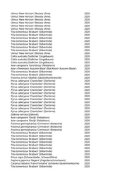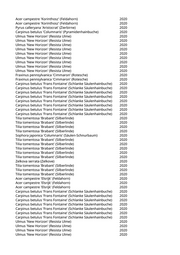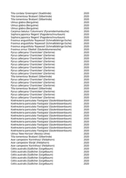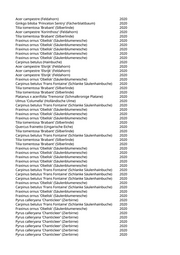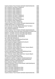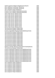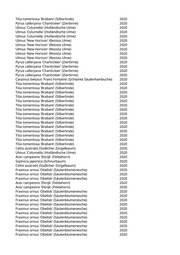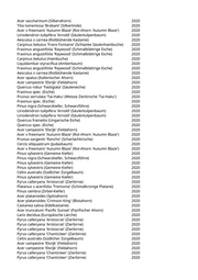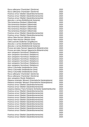 Acer saccharinum (Silberahorn) 2020 Tilia tomentosa 'Brabant' (Silberlinde) 2020 Acer x freemanii 'Autumn Blaze' (Rot-Ahorn 'Autumn Blaze') 2020 Liriodendron tulipifera 'Arnold' (Säulentulpenbaum) 2020 Aesculus x carnea (Rotblühende Kastanie) 2020 Carpinus betulus 'Frans Fontaine' (Schlanke Säulenhainbuche) 2020 Fraxinus angustifolia 'Raywood' (Schmalblättrige Esche) 2020 Fraxinus angustifolia 'Raywood' (Schmalblättrige Esche) 2020 Carpinus betulus (Hainbuche) 2020 Liquidambar styraciflua (Amberbaum) 2020 Fraxinus angustifolia 'Raywood' (Schmalblättrige Esche) 2020 Aesculus x carnea (Rotblühende Kastanie) 2020 Acer opalus (Italienischer Ahorn) 2020 Acer campestre 'Elsrijk' (Feldahorn) 2020 Quercus robur 'Fastigiata' (Säuleneiche) 2020 Fraxinus spec. (Esche) 2020 Prunus serrulata 'Tai-Haku' (Weisse Zierkirsche 'Tai-Haku') 2020 Fraxinus spec. (Esche) 2020 Pinus nigra (Schwarzkiefer, Schwarzföhre) 2020 Liriodendron tulipifera 'Arnold' (Säulentulpenbaum) 2020 Liriodendron tulipifera 'Arnold' (Säulentulpenbaum) 2020 Quercus frainetto (Ungarische Eiche) 2020 Quercus spec. (Eiche) 2020 Acer campestre 'Elsrijk' (Feldahorn) 2020 Acer x freemanii 'Autumn Blaze' (Rot-Ahorn 'Autumn Blaze') 2020 Prunus sargentii 'Rancho' (Scharlachkirsche) 2020 Cercis siliquastrum (Judasbaum) 2020 Acer x freemanii 'Autumn Blaze' (Rot-Ahorn 'Autumn Blaze') 2020 Pinus sylvestris (Gemeine Kiefer) 2020 Pinus nigra (Schwarzkiefer, Schwarzföhre) 2020 Pinus sylvestris (Gemeine Kiefer) 2020 Pinus sylvestris (Gemeine Kiefer) 2020 Celtis australis (Südlicher Zürgelbaum) 2020 Pinus sylvestris (Gemeine Kiefer) 2020 Pyrus calleryana 'Aristocrat' (Zierbirne) 2020 Platanus x acerifolia 'Tremonia' (Schmalkronige Platane) 2020 Pinus cembra (Zirbel-Kiefer) 2020 Acer platanoides (Spitzahorn) 2020 Acer platanoides 'Crimson King' (Blutahorn) 2020 Castanea sativa (Edelkastanie) 2020 Acer truncatum 'Pacific Sunset' (Pazifischer Ahorn) 2020 Larix decidua (Europäische Lärche) 2020 Pyrus calleryana 'Aristocrat' (Zierbirne) 2020 Pyrus calleryana 'Aristocrat' (Zierbirne) 2020 Pyrus calleryana 'Aristocrat' (Zierbirne) 2020 Pyrus calleryana 'Chanticleer' (Zierbirne) 2020 Celtis australis (Südlicher Zürgelbaum) 2020 Acer campestre 'Elsrijk' (Feldahorn) 2020 Acer campestre 'Elsrijk' (Feldahorn) 2020 Pyrus calleryana 'Chanticleer' (Zierbirne) 2020 Pyrus calleryana 'Chanticleer' (Zierbirne) 2020