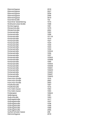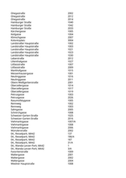 Arsenalstraße 3005 Arsenalstraße 3006 Arsenalstraße 3007 August-Sigl-Straße 1007 August-Sigl-Straße 1011 August-Sigl-Straße 1012 August-Sigl-Straße 2006 Battiggasse 2017 Berlepschgasse 1006 Bleigasse 1005 Bloch-Bauer-Promenade 2002 Bloch-Bauer-Promenade 2003 Bloch-Bauer-Promenade 2004 Bloch-Bauer-Promenade 2005 Bloch-Bauer-Promenade 2006 Bloch-Bauer-Promenade 2007 Bloch-Bauer-Promenade 2008 Bloch-Bauer-Promenade 2009 Bloch-Bauer-Promenade 2010 Bürgergasse 2007 Canettistraße 1001 Canettistraße 1002 Canettistraße 1003 Canettistraße 1004 Canettistraße 1005 Canettistraße 1006 Canettistraße 1007 Columbusplatz 1022 Columbusplatz 1022 Computerstraße 2003 Computerstraße 3028 Daumegasse 1004 Davidgasse 1004 Dieselgasse 2015 Eibesbrunnergasse 1044 Eibesbrunnergasse 1045 Eibesbrunnergasse 1081 Eibesbrunnergasse 1081/A Eibesbrunnergasse 1093 Eibesbrunnergasse 2036 Eibesbrunnergasse 2037 Eibesbrunnergasse 2038 Eibesbrunnergasse 2039 Eibesbrunnergasse 2040 Eibesbrunnergasse 2041 Eibesbrunnergasse 2042 Eibesbrunnergasse 2043 Eibesbrunnergasse 2044 Emilie-Flöge-Weg 1001 Ettenreichgasse 1028 Ettenreichgasse 2015
