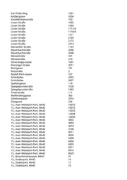 Karl-Toldt-Weg 1001 Keißlergasse 2058 Knödelhüttenstraße 103 Linzer Straße 1002 Linzer Straße 1004 Linzer Straße 1117/A Linzer Straße 1118/A Linzer Straße 1211 Linzer Straße 2169 Linzer Straße 2172 Linzer Straße 2213 Mariahilfer Straße 1147 Mauerbachstraße 2046 Mauerbachstraße 2048 Meiselstraße 241 Meiselstraße 273 Onno-Klopp-Gasse 1001 Penzinger Straße 2011 Reinlgasse 101 Rottstraße 2 Rudolf-Pöch-Gasse 107 Schloßallee 2033 Schloßallee 3027 Spallartgasse 114 Spiegelgrundstraße 1030 Spiegelgrundstraße 1063 Tinterstraße 111 Wolfersberggasse 305 Zehetnergasse 2014 Zolagasse 236 15., Auer-Welsbach-Park, MA42 10070 15., Auer-Welsbach-Park, MA42 10075 15., Auer-Welsbach-Park, MA42 12033 15., Auer-Welsbach-Park, MA42 14028 15., Auer-Welsbach-Park, MA42 14045 15., Auer-Welsbach-Park, MA42 3002 15., Auer-Welsbach-Park, MA42 3004 15., Auer-Welsbach-Park, MA42 3074 15., Auer-Welsbach-Park, MA42 3148 15., Auer-Welsbach-Park, MA42 4011 15., Auer-Welsbach-Park, MA42 4026 15., Auer-Welsbach-Park, MA42 5008 15., Auer-Welsbach-Park, MA42 6004 15., Auer-Welsbach-Park, MA42 6005 15., Auer-Welsbach-Park, MA42 6011 15., Auer-Welsbach-Park, MA42 8016 15., Auer-Welsbach-Park, MA42 8029 15., Braunhirschenpark, MA42 31 15., Dadlerpark, MA42 16 15., Dadlerpark, MA42 17 15., Dadlerpark, MA42 23