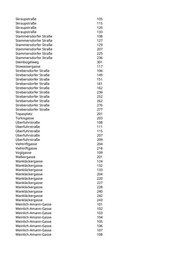 Skraupstraße 105 Skraupstraße 115 Skraupstraße 120 Skraupstraße 133 Stammersdorfer Straße 108 Stammersdorfer Straße 127 Stammersdorfer Straße 129 Stammersdorfer Straße 207 Stammersdorfer Straße 225 Stammersdorfer Straße 236 Steinbügelweg 301 Stowassergasse 117 Strebersdorfer Straße 106 Strebersdorfer Straße 149 Strebersdorfer Straße 151 Strebersdorfer Straße 161 Strebersdorfer Straße 162 Strebersdorfer Straße 236 Strebersdorfer Straße 252 Strebersdorfer Straße 262 Strebersdorfer Straße 276 Strebersdorfer Straße 277 Topasplatz 201 Türkisgasse 203 Überfuhrstraße 108 Überfuhrstraße 111 Überfuhrstraße 115 Überfuhrstraße 207 Überfuhrstraße 209 Viehtriftgasse 204 Viehtriftgasse 218 Voglgasse 109 Walkergasse 201 Wankläckergasse 124 Wankläckergasse 132 Wankläckergasse 133 Wankläckergasse 204 Wankläckergasse 220 Wankläckergasse 227 Wankläckergasse 228 Wankläckergasse 240 Wankläckergasse 242 Wankläckergasse 243 Weinlich-Amann-Gasse 101 Weinlich-Amann-Gasse 102 Weinlich-Amann-Gasse 103 Weinlich-Amann-Gasse 104 Weinlich-Amann-Gasse 105 Weinlich-Amann-Gasse 106 Weinlich-Amann-Gasse 107 Weinlich-Amann-Gasse 108