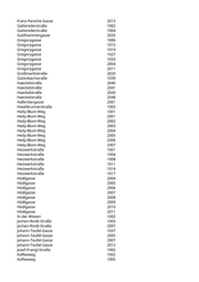 Franz-Parsche-Gasse 2013 Gatterederstraße 1002 Gatterederstraße 1004 Goldhammergasse 2033 Gregorygasse 1006 Gregorygasse 1015 Gregorygasse 1019 Gregorygasse 1027 Gregorygasse 1033 Gregorygasse 2004 Gregorygasse 2011 Großmarktstraße 2020 Gütenbachstraße 1039 Haeckelstraße 2040 Haeckelstraße 2041 Haeckelstraße 2043 Haeckelstraße 2048 Halbrittergasse 2001 Haselbrunnerstraße 1003 Hedy-Blum-Weg 1001 Hedy-Blum-Weg 2001 Hedy-Blum-Weg 2002 Hedy-Blum-Weg 2003 Hedy-Blum-Weg 2004 Hedy-Blum-Weg 2005 Hedy-Blum-Weg 2006 Hedy-Blum-Weg 2007 Heizwerkstraße 1001 Heizwerkstraße 1004 Heizwerkstraße 1008 Heizwerkstraße 1011 Heizwerkstraße 1014 Heizwerkstraße 1017 Hödlgasse 2004 Hödlgasse 2005 Hödlgasse 2006 Hödlgasse 2007 Hödlgasse 2008 Hödlgasse 2009 Hödlgasse 2010 Hödlgasse 2011 In der Wiesen 1002 Jochen-Rindt-Straße 1003 Jochen-Rindt-Straße 2097 Johann-Teufel-Gasse 1037 Johann-Teufel-Gasse 2005 Johann-Teufel-Gasse 2007 Johann-Teufel-Gasse 2012 Josef-Prangl-Straße 1002 Kaffeeweg 1002 Kaffeeweg 1005