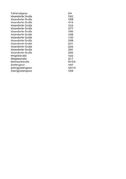 Tullnertalgasse 204 Vösendorfer Straße 1002 Vösendorfer Straße 1008 Vösendorfer Straße 1016 Vösendorfer Straße 1023 Vösendorfer Straße 1077 Vösendorfer Straße 1086 Vösendorfer Straße 1088 Vösendorfer Straße 1100 Vösendorfer Straße 2008 Vösendorfer Straße 2031 Vösendorfer Straße 2056 Vösendorfer Straße 2081 Vösendorfer Straße 2085 Wiegelestraße 1020 Wiegelestraße 2017 Wohnparkstraße 3015/A Ziedlergasse 1007 Zwerggrabengasse 1001/A Zwerggrabengasse 1004