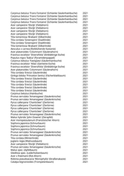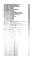 Acer monspessulanum (Französischer Ahorn) 2021 Fagus sylvatica 'Dawyk' (Säulenrotbuche) 2021 Acer platanoides 'Crimson King' (Blutahorn) 2021 Acer campestre (Feldahorn) 2021 Acer campestre (Feldahorn) 2021 Pyrus calleryana 'Chanticleer' (Zierbirne) 2021 Acer platanoides (Spitzahorn) 2021 Sophora japonica (Schnurbaum) 2021 Acer truncatum 'Pacific Sunset' (Pazifischer Ahorn) 2021 Prunus serrulata 'Kanzan' (Japanische Blütenkirsche) 2021 Robinia hispida 'Macrophylla' (Rosenakazie) 2021 Carpinus betulus (Hainbuche) 2021 Davidia involucrata (Taubenbaum) 2021 Acer platanoides (Spitzahorn) 2021 Acer platanoides (Spitzahorn) 2021 Acer campestre (Feldahorn) 2021 Acer campestre (Feldahorn) 2021 Carpinus betulus 'Frans Fontaine' (Schlanke Säulenhainbuche) 2021 Tilia x europaea 'Pallida' (Kaiserlinde) 2021 Ulmus 'Sapporo Autumn Gold' (Sapporo-Ulme) 2021 Carpinus betulus 'Frans Fontaine' (Schlanke Säulenhainbuche) 2021 Acer truncatum 'Pacific Sunset' (Pazifischer Ahorn) 2021 Acer campestre (Feldahorn) 2021 Acer truncatum 'Pacific Sunset' (Pazifischer Ahorn) 2021 Davidia involucrata (Taubenbaum) 2021 Liriodendron tulipifera 'Fastigiatum' (Säulentulpenbaum) 2021 Picea pungens 'Glauca' (Blaufichte) 2021 Carpinus betulus 'Fastigiata' (Säulenhainbuche) 2021 Carpinus betulus 'Fastigiata' (Säulenhainbuche) 2021 Tilia cordata 'Greenspire' (Stadtlinde) 2021 Tilia cordata 'Greenspire' (Stadtlinde) 2021 Fraxinus ornus 'Obelisk' (Säulenblumenesche) 2021 Acer campestre 'Elsrijk' (Feldahorn) 2021 Prunus cerasifera 'Nigra' (Blutpflaume) 2021 Tilia cordata 'Greenspire' (Stadtlinde) 2021 Tilia cordata 'Greenspire' (Stadtlinde) 2021 Celtis australis (Südlicher Zürgelbaum) 2021 Celtis australis (Südlicher Zürgelbaum) 2021 Celtis australis (Südlicher Zürgelbaum) 2021 Celtis australis (Südlicher Zürgelbaum) 2021 Celtis australis (Südlicher Zürgelbaum) 2021 Celtis australis (Südlicher Zürgelbaum) 2021 Celtis australis (Südlicher Zürgelbaum) 2021 Celtis australis (Südlicher Zürgelbaum) 2021 Celtis australis (Südlicher Zürgelbaum) 2021 Celtis australis (Südlicher Zürgelbaum) 2021 Celtis australis (Südlicher Zürgelbaum) 2021 Celtis australis (Südlicher Zürgelbaum) 2021 Celtis australis (Südlicher Zürgelbaum) 2021 Celtis australis (Südlicher Zürgelbaum) 2021 Celtis australis (Südlicher Zürgelbaum) 2021