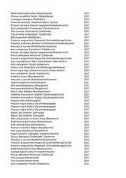 Pinus nigra nigra (Österreichische Schwarzkiefer) 2021 Acer campestre 'Elsrijk' (Feldahorn) 2021 Platanus x acerifolia (Ahornblättrige Platane) 2021 Koelreuteria paniculata (Blasenbaum) 2021 Cladrastis lutea (Gelbholz) 2021 Pinus nigra nigra (Österreichische Schwarzkiefer) 2021 Sophora japonica (Schnurbaum) 2021 Acer pseudoplatanus 'Atropurpureum' (Purpurner Bergahorn) 2021 Morus alba (Weißer Maulbeerbaum) 2021 Quercus robur (Stieleiche) 2021 Salix alba (Silberweide) 2021 Fraxinus angustifolia 'Raywood' (Schmalblättrige Esche) 2021 Pinus nigra nigra (Österreichische Schwarzkiefer) 2021 Aesculus hippocastanum (Rosskastanie) 2021 Acer campestre 'Elsrijk' (Feldahorn) 2021 Acer campestre 'Elsrijk' (Feldahorn) 2021 Acer campestre 'Elsrijk' (Feldahorn) 2021 Alnus glutinosa (Schwarzerle) 2021 Alnus glutinosa (Schwarzerle) 2021 Alnus glutinosa (Schwarzerle) 2021 Alnus glutinosa (Schwarzerle) 2021 Alnus glutinosa (Schwarzerle) 2021 Alnus glutinosa (Schwarzerle) 2021 Alnus glutinosa (Schwarzerle) 2021 Alnus glutinosa (Schwarzerle) 2021 Ulmus x hollandica 'Wredei' (Goldulme) 2021 Salix alba 'Tristis' (Trauerweide) 2021 Salix alba (Silberweide) 2021 Salix alba 'Tristis' (Trauerweide) 2021 Ulmus 'New Horizon' (Resista Ulme) 2021 Salix aurita (Ohr-Weide) 2021 Salix alba 'Tristis' (Trauerweide) 2021 Salix alba 'Tristis' (Trauerweide) 2021 Betula pendula 'Fastigiata' (Säulenbirke) 2021 Acer pseudoplatanus (Bergahorn) 2021 Acer pseudoplatanus (Bergahorn) 2021 Tilia cordata 'Greenspire' (Stadtlinde) 2021 Acer campestre 'Elsrijk' (Feldahorn) 2021 Acer campestre 'Elsrijk' (Feldahorn) 2021 Carpinus betulus 'Frans Fontaine' (Schlanke Säulenhainbuche) 2021 Juglans regia (Walnussbaum) 2021 Prunus armeniaca (Marille) 2021 Acer campestre 'Elsrijk' (Feldahorn) 2021 Acer campestre 'Elsrijk' (Feldahorn) 2021 Acer campestre 'Elsrijk' (Feldahorn) 2021 Acer campestre 'Korinthosz' (Feldahorn) 2021 Acer campestre 'Elsrijk' (Feldahorn) 2021 Acer campestre 'Elsrijk' (Feldahorn) 2021 Acer campestre 'Elsrijk' (Feldahorn) 2021 Acer campestre 'Elsrijk' (Feldahorn) 2021 Acer campestre 'Elsrijk' (Feldahorn) 2021