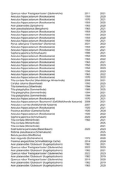 Koelreuteria paniculata 'Fastigiata' (Säulenblasenbaum) 2022 2023 Prunus cerasifera 'Nigra' (Blutpflaume) 2005 2025 Acer pseudoplatanus (Bergahorn) 1930 2024 Acer platanoides 'Olmstedt' (Säulenspitzahorn) 1990 2021 Acer platanoides 'Crimson King' (Blutahorn) 1975 2021 Corylus colurna (Baumhasel) 2014 2020 Acer platanoides (Spitzahorn) 1960 2025 Corylus colurna (Baumhasel) 2013 2020 Sophora japonica 'Regent' (Pagodenschnurbaum) 2008 2019 Corylus colurna (Baumhasel) 2013 2019 Sophora japonica (Schnurbaum) 1960 2019 Sophora japonica (Schnurbaum) 1960 2019 Sophora japonica (Schnurbaum) 1960 2019 Corylus colurna (Baumhasel) 2009 2019 Sophora japonica (Schnurbaum) 1960 2025 Sophora japonica (Schnurbaum) 1960 2019 Sophora japonica (Schnurbaum) 1990 2019 Sophora japonica (Schnurbaum) 1985 2019 Sophora japonica (Schnurbaum) 1999 2019 Sophora japonica (Schnurbaum) 1959 2019 Sophora japonica (Schnurbaum) 1985 2019 Sophora japonica (Schnurbaum) 1960 2019 Sophora japonica (Schnurbaum) 1960 2019 Corylus colurna (Baumhasel) 2013 2021 Corylus colurna (Baumhasel) 2018 2021 Corylus colurna (Baumhasel) 2013 2021 Corylus colurna (Baumhasel) 2013 2021 Sophora japonica (Schnurbaum) 1960 2025 Sophora japonica (Schnurbaum) 2018 2023 Corylus colurna (Baumhasel) 2015 2025 Sophora japonica (Schnurbaum) 1985 2025 Sophora japonica 'Regent' (Pagodenschnurbaum) 2004 2019 Sophora japonica (Schnurbaum) 1985 2019 Koelreuteria paniculata (Blasenbaum) 1991 2020 Koelreuteria paniculata (Blasenbaum) 1991 2021 Koelreuteria paniculata (Blasenbaum) 1991 2020 Acer platanoides (Spitzahorn) 1977 2020 Platanus x acerifolia (Ahornblättrige Platane) 1960 2019 Platanus x acerifolia (Ahornblättrige Platane) 1960 2019 Juglans regia (Walnussbaum) 1992 2019 Fraxinus excelsior (Gemeine Esche) 1999 2021 Tilia platyphyllos (Sommerlinde) 1995 2019 Quercus cerris (Zerreiche) 2023 2025 Robinia pseudoacacia (Scheinakazie) 2021 Tilia spec. (Linde) 1988 2023 Tilia platyphyllos (Sommerlinde) 1991 2021 Tilia platyphyllos (Sommerlinde) 1989 2021 Tilia platyphyllos (Sommerlinde) 1990 2022 Acer campestre (Feldahorn) 1993 2021 Carpinus betulus (Hainbuche) 1995 2021 Acer campestre (Feldahorn) 1994 2019