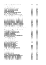 Malus spec. (Apfelbaum) 2008 2025 Prunus cerasifera 'Nigra' (Blutpflaume) 1999 2022 Aesculus x carnea 'Briotii' (Scharlachkastanie) 2013 2022 Acer pseudoplatanus (Bergahorn) 1975 2019 Acer platanoides (Spitzahorn) 1975 2019 Juglans regia (Walnussbaum) 1970 2023 Juglans regia (Walnussbaum) 1970 2021 Populus nigra 'Italica' (Pyramidenpappel) 2019 2024 Populus nigra 'Italica' (Pyramidenpappel) 2017 2020 Populus nigra 'Italica' (Pyramidenpappel) 2017 2022 Juglans regia (Walnussbaum) 1970 2021 Populus simonii 'Fastigiata' (Säulenpappel) 2007 2021 Juglans regia (Walnussbaum) 1970 2019 Fraxinus excelsior (Gemeine Esche) 2005 2021 Fraxinus excelsior (Gemeine Esche) 2005 2021 Acer negundo (Eschenahorn) 1965 2022 Fraxinus excelsior (Gemeine Esche) 1980 2022 Chamaecyparis lawsoniana (Scheinzypresse) 2025 Acer pseudoplatanus (Bergahorn) 1996 2025 Malus spec. (Apfelbaum) 1996 2020 Acer pseudoplatanus (Bergahorn) 1997 2023 Acer pseudoplatanus (Bergahorn) 1966 2021 Celtis australis (Südlicher Zürgelbaum) 2019 2024 Ginkgo biloba (Fächerblattbaum) 2019 2021 Ginkgo biloba 'Autumn Gold' (Fächerblattbaum) 2021 2022 Ginkgo biloba (Fächerblattbaum) 2019 Acer pseudoplatanus (Bergahorn) 1972 2023 Acer pseudoplatanus (Bergahorn) 1972 2021 Pinus nigra nigra (Österreichische Schwarzkiefer) 1980 2019 Pinus nigra nigra (Österreichische Schwarzkiefer) 1980 2019 Pinus nigra nigra (Österreichische Schwarzkiefer) 1980 2019 Tilia cordata (Winterlinde) 1960 2023 Chamaecyparis lawsoniana (Scheinzypresse) 1975 2024 Carpinus betulus 'Frans Fontaine' (Schlanke Säulenhainbuche) 2013 2019 Koelreuteria spec. (Blasenbaum) 2014 2020 Acer platanoides (Spitzahorn) 1986 2020 Acer platanoides (Spitzahorn) 1986 2021 Acer platanoides (Spitzahorn) 1986 2020 Prunus serrulata 'Amanogawa' (Säulenkirsche) 2020 2021 Acer pseudoplatanus (Bergahorn) 1970 2023 Koelreuteria paniculata (Blasenbaum) 2014 2020 Acer platanoides 'Columnare' (Säulenahorn) 2010 2021 Cercis siliquastrum (Judasbaum) 1986 2025 Malus spec. (Apfelbaum) 1986 2020 Malus spec. (Apfelbaum) 1986 2023 Malus spec. (Apfelbaum) 1986 2021 Cercis siliquastrum (Judasbaum) 1986 2023 Malus spec. (Apfelbaum) 1986 2021 Malus spec. (Apfelbaum) 1995 2021 Acer platanoides (Spitzahorn) 1986 2020 Acer platanoides (Spitzahorn) 1986 2021