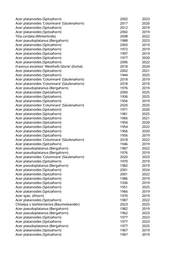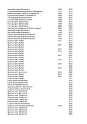 Acer platanoides (Spitzahorn) 1900 2020 Cryptomeria japonica (Japanische Sicheltanne) 2022 2023 Fraxinus excelsior 'Pendula' (Hängeesche) 1980 2023 Liquidambar styraciflua (Amberbaum) 2008 2024 Tilia platyphyllos (Sommerlinde) 1930 2020 Picea omorika (Serbische Fichte) 1980 2021 Picea pungens (Stechfichte) 1990 2024 Picea pungens (Stechfichte) 1990 2024 Picea pungens (Stechfichte) 2005 2024 Chamaecyparis lawsoniana (Scheinzypresse) 2005 2025 Acer platanoides (Spitzahorn) 1950 2023 Acer platanoides (Spitzahorn) 1930 2019 Robinia pseudoacacia (Scheinakazie) 1980 2019 Robinia pseudoacacia (Scheinakazie) 1951 2019 Robinia pseudoacacia (Scheinakazie) 1983 2019 Quercus spec. (Eiche) 2021 2022 Quercus spec. (Eiche) 2022 Quercus spec. (Eiche) 2021 2022 Quercus spec. (Eiche) 2022 Quercus spec. (Eiche) 2021 2022 Quercus spec. (Eiche) 2021 2022 Quercus spec. (Eiche) 2022 Quercus spec. (Eiche) 2021 2022 Quercus spec. (Eiche) 2022 Quercus spec. (Eiche) 2021 2022 Quercus spec. (Eiche) 2022 Quercus spec. (Eiche) 2021 2022 Quercus spec. (Eiche) 2022 Quercus spec. (Eiche) 2021 2022 Quercus spec. (Eiche) 2022 Quercus cerris (Zerreiche) 2019 2020 Quercus spec. (Eiche) 2021 2022 Quercus spec. (Eiche) 2021 2022 Quercus spec. (Eiche) 2022 Fagus sylvatica (Rotbuche) 2024 Fagus sylvatica (Rotbuche) 2024 Betula pendula (Weißbirke) 2020 Quercus pubescens (Flaumeiche) 2020 Carpinus betulus (Hainbuche) 2020 Quercus robur (Stieleiche) 2020 Quercus cerris (Zerreiche) 2020 Quercus robur (Stieleiche) 2024 Quercus robur (Stieleiche) 2020 Quercus robur (Stieleiche) 2020 Quercus robur (Stieleiche) 2023 Carpinus betulus (Hainbuche) 2025 Quercus coccinea (Scharlach-Eiche) 2018 2020 Quercus robur (Stieleiche) 2020 Quercus robur (Stieleiche) 2020 Quercus robur (Stieleiche) 2023 Quercus robur (Stieleiche) 2020