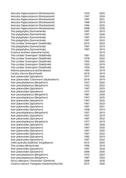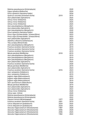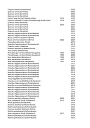 Robinia pseudoacacia (Scheinakazie) 2020 Fagus sylvatica (Rotbuche) 2024 Pinus sylvestris (Gemeine Kiefer) 2024 Quercus coccinea (Scharlach-Eiche) 2019 2019 Acer platanoides (Spitzahorn) 2025 Ulmus minor (Feldulme) 2025 Ulmus minor (Feldulme) 2025 Ulmus minor (Feldulme) 2025 Acer pseudoplatanus (Bergahorn) 2021 Acer platanoides (Spitzahorn) 2020 Acer pseudoplatanus (Bergahorn) 2020 Pinus sylvestris (Gemeine Kiefer) 2020 Pinus nigra (Schwarzkiefer, Schwarzföhre) 2023 Pinus nigra (Schwarzkiefer, Schwarzföhre) 2023 Acer platanoides (Spitzahorn) 2023 Ailanthus altissima (Götterbaum) 2023 Tilia cordata (Winterlinde) 2025 Acer pseudoplatanus (Bergahorn) 2019 Fraxinus excelsior (Gemeine Esche) 2019 Fraxinus excelsior (Gemeine Esche) 2019 Fraxinus excelsior (Gemeine Esche) 2019 Betula pendula (Weißbirke) 2018 2019 Acer pseudoplatanus (Bergahorn) 2019 Acer pseudoplatanus (Bergahorn) 2019 Acer pseudoplatanus (Bergahorn) 2019 Acer platanoides (Spitzahorn) 2025 Fraxinus excelsior (Gemeine Esche) 2020 Betula pendula (Weißbirke) 2019 Acer platanoides (Spitzahorn) 2023 Fraxinus excelsior (Gemeine Esche) 2016 2023 Acer campestre (Feldahorn) 2019 Acer campestre (Feldahorn) 2019 Juglans regia (Walnussbaum) 2022 Juglans regia (Walnussbaum) 2019 Juglans regia (Walnussbaum) 2019 Acer saccharinum (Silberahorn) 2020 Betula pendula (Weißbirke) 2019 Acer platanoides (Spitzahorn) 2020 Acer platanoides (Spitzahorn) 2022 Ulmus minor (Feldulme) 2020 Ulmus spec. (Ulme) 2020 Robinia pseudoacacia (Scheinakazie) 2024 Robinia pseudoacacia (Scheinakazie) 2022 Populus simonii (Birkenpappel) 1977 2020 Fraxinus excelsior (Gemeine Esche) 2001 2019 Cercis siliquastrum (Judasbaum) 2024 2025 Cercis siliquastrum (Judasbaum) 2024 2025 Aesculus hippocastanum (Rosskastanie) 1987 2020 Aesculus hippocastanum (Rosskastanie) 2006 2020 Aesculus hippocastanum (Rosskastanie) 2006 2025 Aesculus hippocastanum (Rosskastanie) 1982 2022