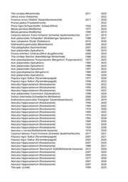 Acer platanoides (Spitzahorn) 1987 2023 Acer platanoides 'Columnare' (Säulenahorn) 2006 2020 Fraxinus excelsior (Gemeine Esche) 2002 2021 Tilia platyphyllos (Sommerlinde) 1941 2021 Tilia x europaea 'Pallida' (Kaiserlinde) 2018 2023 Pyrus spec. (Birne) 2020 2021 Pyrus spec. (Birne) 2020 2021 Tilia cordata (Winterlinde) 1996 2022 Tilia tomentosa 'Brabant' (Silberlinde) 2022 2024 Tilia platyphyllos (Sommerlinde) 1961 2019 Tilia cordata (Winterlinde) 1977 2023 Tilia cordata (Winterlinde) 1997 2023 Tilia platyphyllos (Sommerlinde) 1987 2021 Tilia platyphyllos (Sommerlinde) 1977 2020 Tilia cordata (Winterlinde) 1922 2019 Acer pseudoplatanus (Bergahorn) 2021 Acer pseudoplatanus (Bergahorn) 2023 Populus spec. (Pappel) 2024 Acer campestre (Feldahorn) 2024 Acer campestre (Feldahorn) 1982 2023 Crataegus spec. (Dorn) 2023 Acer platanoides (Spitzahorn) 2023 Prunus avium (Vogelkirsche) 2022 Prunus avium (Vogelkirsche) 2023 Prunus avium (Vogelkirsche) 2021 Prunus avium (Vogelkirsche) 2021 Prunus avium (Vogelkirsche) 2023 Laburnum anagyroides (Gemeiner Goldregen) 2021 Laburnum anagyroides (Gemeiner Goldregen) 2021 Acer campestre (Feldahorn) 2021 Paulownia tomentosa (Blauglockenbaum) 2000 2023 Juglans nigra (Schwarznussbaum) 1954 2019 Acer platanoides (Spitzahorn) 1980 2022 Aesculus hippocastanum (Rosskastanie) 1957 2023 Aesculus hippocastanum (Rosskastanie) 1947 2019 Aesculus hippocastanum (Rosskastanie) 2002 2021 Aesculus hippocastanum (Rosskastanie) 1987 2021 Aesculus x carnea (Rotblühende Kastanie) 1999 2023 Aesculus hippocastanum (Rosskastanie) 1997 2025 Aesculus hippocastanum (Rosskastanie) 1992 2020 Aesculus hippocastanum (Rosskastanie) 1932 2020 Aesculus hippocastanum (Rosskastanie) 1947 2022 Ulmus 'New Horizon' (Resista Ulme) 2016 2019 Ulmus 'New Horizon' (Resista Ulme) 2015 2019 Ulmus 'New Horizon' (Resista Ulme) 2016 2019 Ulmus 'New Horizon' (Resista Ulme) 2015 2019 Acer pseudoplatanus (Bergahorn) 1966 2019 Zelkova serrata (Zelkove) 2015 2023 Acer pseudoplatanus 'Leopoldii' (Bergahorn) 1981 2019 Acer pseudoplatanus (Bergahorn) 1971 2019 Acer platanoides (Spitzahorn) 1986 2019
