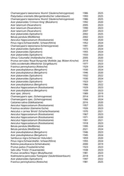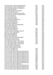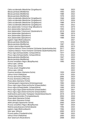 Acer platanoides 'Cleveland' (Kegelspitzahorn) 2018 2021 Acer platanoides 'Crimson King' (Blutahorn) 1967 2023 Celtis occidentalis (Westlicher Zürgelbaum) 1963 2024 Tilia cordata (Winterlinde) 1940 2023 Celtis australis (Südlicher Zürgelbaum) 2011 2019 Ulmus 'Regal' (Resista Ulme) 2018 2022 Fraxinus excelsior 'Westhofs Glorie' (Esche) 2017 2020 Acer platanoides 'Cleveland' (Kegelspitzahorn) 2020 2022 Ulmus minor (Feldulme) 1953 2019 Tilia cordata (Winterlinde) 1956 2023 Acer campestre (Feldahorn) 1980 2025 Acer pseudoplatanus (Bergahorn) 1929 2020 Betula pendula (Weißbirke) 1979 2020 Acer platanoides (Spitzahorn) 1969 2023 Betula pendula (Weißbirke) 1954 2022 Populus nigra 'Italica' (Pyramidenpappel) 1909 2024 Betula pendula (Weißbirke) 2023 Betula pendula (Weißbirke) 2023 Acer platanoides (Spitzahorn) 1975 2023 Prunus domestica (Pflaume) 1992 2024 Paulownia tomentosa (Blauglockenbaum) 2019 2021 Salix alba 'Tristis' (Trauerweide) 2005 2023 Betula pendula (Weißbirke) 2001 2020 Betula pendula (Weißbirke) 2005 2023 Betula pendula (Weißbirke) 2005 2023 Populus nigra 'Italica' (Pyramidenpappel) 1957 2023 Acer saccharum (Zucker-Ahorn) 1972 2023 Tilia platyphyllos (Sommerlinde) 1948 2020 Pinus nigra (Schwarzkiefer, Schwarzföhre) 1989 2024 Pinus nigra (Schwarzkiefer, Schwarzföhre) 1982 2020 Pinus nigra (Schwarzkiefer, Schwarzföhre) 2018 2019 Acer pseudoplatanus (Bergahorn) 2025 Fraxinus excelsior (Gemeine Esche) 2023 Fraxinus excelsior (Gemeine Esche) 2022 Prunus avium (Vogelkirsche) 1985 2021 Prunus avium (Vogelkirsche) 1948 2024 Prunus serrulata 'Kanzan' (Japanische Blütenkirsche) 1977 2025 Prunus serrulata 'Kanzan' (Japanische Blütenkirsche) 1987 2019 Prunus serrulata 'Kanzan' (Japanische Blütenkirsche) 1978 2023 Prunus serrulata 'Kanzan' (Japanische Blütenkirsche) 2005 2025 Prunus serrulata 'Kanzan' (Japanische Blütenkirsche) 1993 2019 Prunus serrulata 'Kanzan' (Japanische Blütenkirsche) 2008 2019 Prunus serrulata 'Kanzan' (Japanische Blütenkirsche) 2008 2020 Prunus serrulata 'Kanzan' (Japanische Blütenkirsche) 2004 2019 Prunus serrulata 'Kanzan' (Japanische Blütenkirsche) 2005 2020 Prunus serrulata 'Kanzan' (Japanische Blütenkirsche) 1981 2019 Liriodendron tulipifera (Tulpenbaum) 2019 2025 Prunus serrulata 'Kanzan' (Japanische Blütenkirsche) 2005 2020 Prunus serrulata 'Kanzan' (Japanische Blütenkirsche) 2007 2019 Prunus serrulata 'Kanzan' (Japanische Blütenkirsche) 1987 2025 Prunus serrulata 'Kanzan' (Japanische Blütenkirsche) 1998 2023