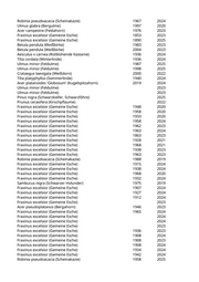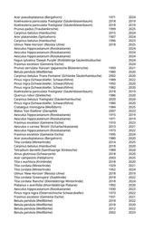 Celtis occidentalis (Westlicher Zürgelbaum) 1968 2023 Betula pendula (Weißbirke) 1993 2025 Betula pendula (Weißbirke) 1988 2022 Betula pendula (Weißbirke) 1978 2023 Celtis occidentalis (Westlicher Zürgelbaum) 1968 2020 Celtis occidentalis (Westlicher Zürgelbaum) 1973 2024 Celtis occidentalis (Westlicher Zürgelbaum) 1988 2019 Celtis occidentalis (Westlicher Zürgelbaum) 1983 2022 Acer platanoides 'Crimson King' (Blutahorn) 1973 2019 Acer platanoides (Spitzahorn) 1993 2019 Acer platanoides 'Columnare' (Säulenahorn) 2018 2024 Acer platanoides (Spitzahorn) 1988 2019 Acer platanoides (Spitzahorn) 1998 2019 Acer platanoides (Spitzahorn) 1988 2025 Juglans regia (Walnussbaum) 2021 Betula pendula (Weißbirke) 1975 2020 Betula pendula (Weißbirke) 1987 2021 Corylus colurna (Baumhasel) 2005 2019 Carpinus betulus 'Frans Fontaine' (Schlanke Säulenhainbuche) 2017 2021 Carpinus betulus 'Frans Fontaine' (Schlanke Säulenhainbuche) 2017 2023 Pinus nigra (Schwarzkiefer, Schwarzföhre) 1977 2024 Pinus nigra (Schwarzkiefer, Schwarzföhre) 1972 2023 Betula pendula (Weißbirke) 1967 2023 Betula pendula (Weißbirke) 1967 2025 Prunus cerasifera 'Nigra' (Blutpflaume) 1995 2023 Ulmus spec. (Ulme) 2022 Ulmus spec. (Ulme) 2022 Prunus avium (Vogelkirsche) 2022 Ulmus spec. (Ulme) 2022 Fraxinus excelsior (Gemeine Esche) 1959 2024 Ulmus minor (Feldulme) 1979 2025 Prunus domestica (Pflaume) 2006 2023 Prunus domestica (Pflaume) 2006 2023 Picea abies (Gemeine Fichte) 1957 2024 Chamaecyparis lawsoniana (Scheinzypresse) 1983 2024 Pinus nigra nigra (Österreichische Schwarzkiefer) 1963 2025 Pinus nigra (Schwarzkiefer, Schwarzföhre) 1990 2019 Pinus nigra nigra (Österreichische Schwarzkiefer) 2020 2021 Pinus nigra nigra (Österreichische Schwarzkiefer) 2022 2024 Koelreuteria paniculata 'Fastigiata' (Säulenblasenbaum) 2018 2019 Catalpa bignonioides (Trompetenbaum) 2004 2024 Picea abies (Gemeine Fichte) 1983 2020 Picea abies (Gemeine Fichte) 1990 2025 Abies pinsapo (Spanische Tanne) 2000 2024 Prunus cerasifera 'Nigra' (Blutpflaume) 1987 2024 Robinia pseudoacacia (Scheinakazie) 1996 2025 Juglans regia (Walnussbaum) 1966 2024 Acer spec. (Ahorn) 2000 2019 Prunus padus (Traubenkirsche) 1989 2025 Ulmus minor (Feldulme) 2000 2023 Acer tataricum (Feuerahorn) 2008 2022
