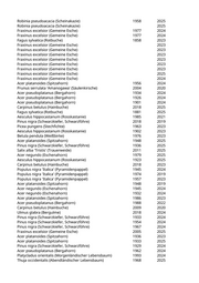 Robinia pseudoacacia (Scheinakazie) 1967 2024 Ulmus glabra (Bergulme) 1997 2020 Acer campestre (Feldahorn) 1976 2023 Fraxinus excelsior (Gemeine Esche) 1853 2023 Fraxinus excelsior (Gemeine Esche) 1890 2025 Betula pendula (Weißbirke) 1983 2023 Betula pendula (Weißbirke) 2004 2023 Aesculus x carnea (Rotblühende Kastanie) 1936 2024 Tilia cordata (Winterlinde) 1936 2024 Ulmus minor (Feldulme) 1987 2025 Ulmus minor (Feldulme) 1998 2025 Crataegus laevigata (Weißdorn) 2000 2022 Tilia platyphyllos (Sommerlinde) 1940 2024 Acer platanoides 'Globosum' (Kugelspitzahorn) 2019 2024 Ulmus minor (Feldulme) 2023 Ulmus minor (Feldulme) 2023 Pinus nigra (Schwarzkiefer, Schwarzföhre) 2025 Prunus cerasifera (Kirschpflaume) 2022 Fraxinus excelsior (Gemeine Esche) 1948 2020 Fraxinus excelsior (Gemeine Esche) 1958 2020 Fraxinus excelsior (Gemeine Esche) 1933 2020 Fraxinus excelsior (Gemeine Esche) 1958 2024 Fraxinus excelsior (Gemeine Esche) 1962 2023 Fraxinus excelsior (Gemeine Esche) 1963 2024 Fraxinus excelsior (Gemeine Esche) 1863 2023 Fraxinus excelsior (Gemeine Esche) 1928 2021 Fraxinus excelsior (Gemeine Esche) 1968 2021 Fraxinus excelsior (Gemeine Esche) 1938 2023 Fraxinus excelsior (Gemeine Esche) 1963 2023 Robinia pseudoacacia (Scheinakazie) 1988 2019 Fraxinus excelsior (Gemeine Esche) 1915 2024 Fraxinus excelsior (Gemeine Esche) 1938 2024 Fraxinus excelsior (Gemeine Esche) 1968 2020 Fraxinus excelsior (Gemeine Esche) 1932 2024 Sambucus nigra (Schwarzer Holunder) 1975 2019 Fraxinus excelsior (Gemeine Esche) 1907 2024 Fraxinus excelsior (Gemeine Esche) 1927 2024 Fraxinus excelsior (Gemeine Esche) 1912 2024 Fraxinus excelsior (Gemeine Esche) 2023 Acer pseudoplatanus (Bergahorn) 1946 2023 Fraxinus excelsior (Gemeine Esche) 1965 2024 Fraxinus excelsior (Gemeine Esche) 2024 Fraxinus excelsior (Gemeine Esche) 2024 Fraxinus excelsior (Gemeine Esche) 2023 Fraxinus excelsior (Gemeine Esche) 1936 2023 Fraxinus excelsior (Gemeine Esche) 1908 2024 Fraxinus excelsior (Gemeine Esche) 1908 2023 Fraxinus excelsior (Gemeine Esche) 1908 2024 Fraxinus excelsior (Gemeine Esche) 1934 2024 Fraxinus excelsior (Gemeine Esche) 1942 2024 Robinia pseudoacacia (Scheinakazie) 1958 2025