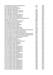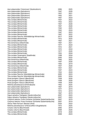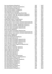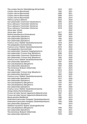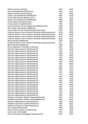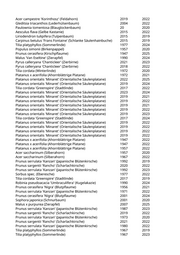 Acer campestre 'Korinthosz' (Feldahorn) 2019 2022 Gleditsia triacanthos (Lederhülsenbaum) 2004 2022 Paulownia tomentosa (Blauglockenbaum) 20 2020 Aesculus flava (Gelbe Kastanie) 2015 2022 Liriodendron tulipifera (Tulpenbaum) 2015 2019 Carpinus betulus 'Frans Fontaine' (Schlanke Säulenhainbuche) 2015 2019 Tilia platyphyllos (Sommerlinde) 1977 2024 Populus simonii (Birkenpappel) 1957 2020 Prunus cerasifera (Kirschpflaume) 1947 2025 Malus 'Van Eseltine' (Zierapfel) 1990 2024 Pyrus calleryana 'Chanticleer' (Zierbirne) 2021 2023 Pyrus calleryana 'Chanticleer' (Zierbirne) 2018 2022 Tilia cordata (Winterlinde) 1972 2020 Platanus x acerifolia (Ahornblättrige Platane) 1972 2021 Platanus orientalis 'Minaret' (Orientalische Säulenplatane) 2022 2025 Platanus orientalis 'Minaret' (Orientalische Säulenplatane) 2019 2024 Tilia cordata 'Greenspire' (Stadtlinde) 2017 2022 Platanus orientalis 'Minaret' (Orientalische Säulenplatane) 2023 2024 Platanus orientalis 'Minaret' (Orientalische Säulenplatane) 2019 2021 Platanus orientalis 'Minaret' (Orientalische Säulenplatane) 2019 2022 Platanus orientalis 'Minaret' (Orientalische Säulenplatane) 2019 2021 Platanus orientalis 'Minaret' (Orientalische Säulenplatane) 2019 2022 Platanus orientalis 'Minaret' (Orientalische Säulenplatane) 2019 2023 Tilia cordata 'Greenspire' (Stadtlinde) 2017 2024 Platanus orientalis 'Minaret' (Orientalische Säulenplatane) 2019 2022 Platanus orientalis 'Minaret' (Orientalische Säulenplatane) 2019 2022 Platanus orientalis 'Minaret' (Orientalische Säulenplatane) 2019 2022 Platanus orientalis 'Minaret' (Orientalische Säulenplatane) 2019 2022 Platanus x acerifolia (Ahornblättrige Platane) 1947 2022 Platanus x acerifolia (Ahornblättrige Platane) 1947 2022 Platanus x acerifolia (Ahornblättrige Platane) 1957 2022 Acer saccharinum (Silberahorn) 1957 2020 Acer saccharinum (Silberahorn) 1967 2022 Prunus serrulata 'Kanzan' (Japanische Blütenkirsche) 1992 2019 Prunus sargentii 'Rancho' (Scharlachkirsche) 2020 2022 Prunus serrulata 'Kanzan' (Japanische Blütenkirsche) 1992 2023 Sorbus spec. (Eberesche) 1977 2022 Tilia cordata 'Greenspire' (Stadtlinde) 2017 2019 Robinia pseudoacacia 'Umbraculifera' (Kugelakazie) 1990 2024 Prunus cerasifera 'Nigra' (Blutpflaume) 1956 2021 Prunus serrulata 'Kanzan' (Japanische Blütenkirsche) 1971 2022 Prunus cerasifera 'Nigra' (Blutpflaume) 2001 2024 Sophora japonica (Schnurbaum) 2001 2020 Malus x purpurea (Zierapfel) 2007 2025 Prunus serrulata 'Kanzan' (Japanische Blütenkirsche) 1987 2023 Prunus sargentii 'Rancho' (Scharlachkirsche) 2019 2022 Prunus serrulata 'Kanzan' (Japanische Blütenkirsche) 1973 2020 Prunus sargentii 'Rancho' (Scharlachkirsche) 2021 2022 Prunus serrulata 'Kanzan' (Japanische Blütenkirsche) 1980 2022 Tilia platyphyllos (Sommerlinde) 1967 2019 Tilia platyphyllos (Sommerlinde) 1967 2023