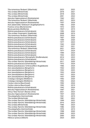 Tilia tomentosa 'Brabant' (Silberlinde) 2023 2025 Tilia cordata (Winterlinde) 2018 2021 Tilia cordata (Winterlinde) 2018 2025 Tilia cordata (Winterlinde) 2001 2022 Aesculus hippocastanum (Rosskastanie) 1942 2021 Tilia tomentosa 'Brabant' (Silberlinde) 2021 2023 Aesculus hippocastanum (Rosskastanie) 1937 2024 Acer platanoides 'Globosum' (Kugelspitzahorn) 1982 2020 Fraxinus ornus (Blumenesche) 1972 2025 Betula pendula (Weißbirke) 1957 2019 Robinia pseudoacacia (Scheinakazie) 1995 2024 Tilia cordata 'Greenspire' (Stadtlinde) 2008 2019 Tilia tomentosa 'Brabant' (Silberlinde) 2023 2023 Robinia pseudoacacia (Scheinakazie) 1967 2020 Robinia pseudoacacia (Scheinakazie) 1999 2020 Robinia pseudoacacia (Scheinakazie) 1977 2023 Robinia pseudoacacia (Scheinakazie) 1942 2020 Robinia pseudoacacia (Scheinakazie) 1957 2021 Tilia tomentosa 'Brabant' (Silberlinde) 2021 2023 Robinia pseudoacacia (Scheinakazie) 1977 2024 Robinia pseudoacacia (Scheinakazie) 1999 2024 Robinia pseudoacacia (Scheinakazie) 1932 2023 Robinia pseudoacacia 'Monophylla' (Straßenakazie) 2014 2023 Robinia pseudoacacia (Scheinakazie) 1972 2023 Tilia cordata 'Rancho' (Kleinblättrige Winterlinde) 2011 2020 Robinia pseudoacacia (Scheinakazie) 1972 2024 Robinia pseudoacacia 'Umbraculifera' (Kugelakazie) 1966 2024 Acer pseudoplatanus (Bergahorn) 1932 2025 Acer pseudoplatanus (Bergahorn) 1932 2025 Acer pseudoplatanus (Bergahorn) 1952 2024 Acer pseudoplatanus (Bergahorn) 1957 2023 Acer pseudoplatanus (Bergahorn) 1937 2020 Crataegus laevigata (Weißdorn) 1992 2020 Crataegus laevigata (Weißdorn) 1992 2024 Corylus colurna (Baumhasel) 1992 2024 Corylus colurna (Baumhasel) 1992 2019 Robinia pseudoacacia (Scheinakazie) 1942 2024 Aesculus hippocastanum (Rosskastanie) 1947 2021 Ulmus 'New Horizon' (Resista Ulme) 2021 2023 Aesculus hippocastanum (Rosskastanie) 1957 2025 Tilia platyphyllos (Sommerlinde) 1941 2019 Tilia cordata (Winterlinde) 1981 2022 Tilia cordata 'Rancho' (Kleinblättrige Winterlinde) 1999 2025 Tilia cordata 'Rancho' (Kleinblättrige Winterlinde) 2016 2023 Tilia cordata (Winterlinde) 1946 2023 Tilia cordata 'Rancho' (Kleinblättrige Winterlinde) 1986 2020 Tilia platyphyllos (Sommerlinde) 1976 2019 Tilia cordata 'Rancho' (Kleinblättrige Winterlinde) 1998 2020 Tilia cordata 'Rancho' (Kleinblättrige Winterlinde) 2009 2023 Tilia cordata 'Rancho' (Kleinblättrige Winterlinde) 2000 2023 Hibiscus syriacus (Eibisch) 2023 2025
