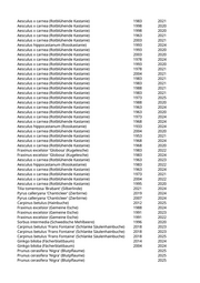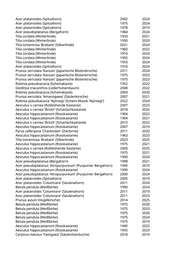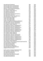 Fraxinus excelsior (Gemeine Esche) 2004 2019 Fraxinus excelsior 'Altena' (Gemeine Esche) 2018 2024 Fraxinus excelsior 'Altena' (Gemeine Esche) 2017 2024 Fraxinus pennsylvanica (Rotesche) 1984 2024 Fraxinus excelsior (Gemeine Esche) 1971 2024 Robinia pseudoacacia (Scheinakazie) 1935 2022 Acer platanoides (Spitzahorn) 1985 2024 Acer platanoides (Spitzahorn) 1993 2019 Acer platanoides (Spitzahorn) 1997 2024 Acer pseudoplatanus (Bergahorn) 1981 2019 Acer platanoides 'Columnare' (Säulenahorn) 2009 2022 Fraxinus excelsior (Gemeine Esche) 1951 2024 Acer platanoides 'Eurostar' (Spitzahorn) 2007 2024 Tilia cordata (Winterlinde) 1959 2024 Fraxinus excelsior (Gemeine Esche) 1991 2024 Acer pseudoplatanus 'Atropurpureum' (Purpurner Bergahorn) 1971 2020 Fraxinus excelsior (Gemeine Esche) 1979 2023 Fraxinus excelsior (Gemeine Esche) 1954 2024 Fraxinus excelsior (Gemeine Esche) 1985 2024 Fraxinus excelsior 'Altena' (Gemeine Esche) 2017 2019 Acer pseudoplatanus (Bergahorn) 1985 2019 Fraxinus excelsior (Gemeine Esche) 1961 2024 Fraxinus excelsior (Gemeine Esche) 2005 2024 Fraxinus excelsior 'Altena' (Gemeine Esche) 2013 2021 Fraxinus excelsior (Gemeine Esche) 1989 2019 Acer pseudoplatanus (Bergahorn) 1977 2021 Acer platanoides (Spitzahorn) 1983 2024 Fraxinus excelsior 'Altena' (Gemeine Esche) 2015 2021 Magnolia spec. (Magnolie) 2016 2020 Magnolia spec. (Magnolie) 2016 2025 Corylus colurna (Baumhasel) 2015 2019 Chitalpa x tashkentensis (Baumoleander) 2022 2025 Sorbus aucuparia 'Fastigiata' (Säuleneberesche) 2014 2019 Fraxinus excelsior (Gemeine Esche) 2001 2024 Acer pseudoplatanus (Bergahorn) 1989 2023 Acer platanoides (Spitzahorn) 2019 Fraxinus excelsior (Gemeine Esche) 2019 Crataegus laevigata (Weißdorn) 2019 Acer platanoides (Spitzahorn) 2004 2019 Acer platanoides (Spitzahorn) 2004 2025 Aesculus hippocastanum (Rosskastanie) 1985 2019 Aesculus x carnea (Rotblühende Kastanie) 1985 2021 Aesculus hippocastanum (Rosskastanie) 1970 2021 Aesculus x carnea (Rotblühende Kastanie) 2004 2023 Aesculus x carnea (Rotblühende Kastanie) 2004 2021 Aesculus x carnea (Rotblühende Kastanie) 1925 2019 Aesculus x carnea (Rotblühende Kastanie) 1990 2025 Aesculus hippocastanum (Rosskastanie) 1995 2021 Aesculus x carnea (Rotblühende Kastanie) 2004 2023 Aesculus hippocastanum (Rosskastanie) 1975 2021 Ulmus 'New Horizon' (Resista Ulme) 2021 2024