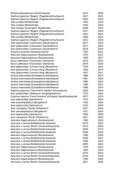 Robinia pseudoacacia (Scheinakazie) 2019 2024 Sophora japonica 'Regent' (Pagodenschnurbaum) 2021 2025 Sophora japonica 'Regent' (Pagodenschnurbaum) 2022 2024 Tilia cordata (Winterlinde) 1963 2024 Tilia cordata (Winterlinde) 1983 2024 Tilia cordata 'Greenspire' (Stadtlinde) 2008 2019 Sophora japonica 'Regent' (Pagodenschnurbaum) 2021 2024 Sophora japonica 'Regent' (Pagodenschnurbaum) 2022 2025 Tilia cordata (Winterlinde) 1969 2022 Sophora japonica 'Regent' (Pagodenschnurbaum) 2022 2024 Acer platanoides 'Columnare' (Säulenahorn) 2017 2023 Acer platanoides 'Columnare' (Säulenahorn) 2017 2023 Acer platanoides 'Columnare' (Säulenahorn) 2018 2024 Fraxinus excelsior (Gemeine Esche) 1933 2022 Aesculus hippocastanum (Rosskastanie) 1973 2022 Aesculus hippocastanum (Rosskastanie) 1960 2021 Pyrus calleryana 'Chanticleer' (Zierbirne) 2019 2022 Pyrus calleryana 'Chanticleer' (Zierbirne) 2019 2020 Acer platanoides 'Crimson King' (Blutahorn) 1953 2022 Acer platanoides 'Crimson King' (Blutahorn) 1954 2019 Acer platanoides 'Crimson King' (Blutahorn) 1957 2021 Sorbus intermedia (Schwedische Mehlbeere) 1985 2019 Sorbus intermedia (Schwedische Mehlbeere) 1981 2024 Sorbus intermedia (Schwedische Mehlbeere) 1985 2024 Sorbus intermedia (Schwedische Mehlbeere) 1986 2023 Sorbus intermedia (Schwedische Mehlbeere) 1986 2019 Sophora japonica 'Columnaris' (Säulen-Schnurbaum) 2020 2024 Acer platanoides 'Globosum' (Kugelspitzahorn) 1972 2020 Carpinus betulus 'Frans Fontaine' (Schlanke Säulenhainbuche) 2017 2019 Acer platanoides (Spitzahorn) 1915 2024 Acer pseudoplatanus (Bergahorn) 1926 2024 Acer platanoides (Spitzahorn) 1932 2020 Acer campestre 'Elsrijk' (Feldahorn) 2021 2024 Acer pseudoplatanus (Bergahorn) 1921 2020 Acer platanoides (Spitzahorn) 1969 2020 Acer campestre 'Elsrijk' (Feldahorn) 2021 2025 Aesculus hippocastanum (Rosskastanie) 1980 2024 Aesculus x carnea (Rotblühende Kastanie) 2010 2022 Aesculus x carnea 'Briotii' (Scharlachkastanie) 2016 2024 Aesculus x carnea (Rotblühende Kastanie) 2009 2019 Aesculus x carnea (Rotblühende Kastanie) 2006 2020 Aesculus hippocastanum (Rosskastanie) 1960 2024 Aesculus x carnea (Rotblühende Kastanie) 2006 2022 Aesculus x carnea (Rotblühende Kastanie) 1980 2022 Aesculus x carnea (Rotblühende Kastanie) 2005 2022 Aesculus hippocastanum (Rosskastanie) 1970 2025 Aesculus hippocastanum (Rosskastanie) 1960 2024 Aesculus x carnea 'Briotii' (Scharlachkastanie) 2016 2023 Aesculus x carnea 'Briotii' (Scharlachkastanie) 2016 2024 Aesculus hippocastanum (Rosskastanie) 1990 2020 Aesculus x carnea 'Briotii' (Scharlachkastanie) 2021 2024