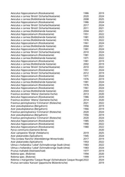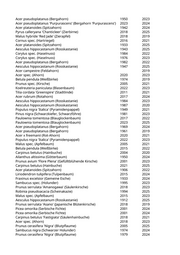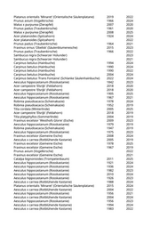 Acer pseudoplatanus (Bergahorn) 1950 2023 Acer pseudoplatanus 'Purpurascens' (Bergahorn 'Purpurascens') 2023 2024 Acer platanoides (Spitzahorn) 1942 2024 Pyrus calleryana 'Chanticleer' (Zierbirne) 2018 2025 Malus hybride 'Red Jade' (Zierapfel) 2018 2019 Cornus spec. (Hartriegel) 2016 2021 Acer platanoides (Spitzahorn) 1933 2025 Aesculus hippocastanum (Rosskastanie) 1943 2025 Corylus spec. (Haselnuss) 1984 2022 Corylus spec. (Haselnuss) 1976 2023 Acer pseudoplatanus (Bergahorn) 1982 2022 Aesculus hippocastanum (Rosskastanie) 1947 2025 Acer campestre (Feldahorn) 2019 Acer spec. (Ahorn) 2020 2023 Betula pendula (Weißbirke) 1974 2019 Prunus spec. (Kirsche) 2005 2021 Koelreuteria paniculata (Blasenbaum) 2022 2023 Tilia cordata 'Greenspire' (Stadtlinde) 2011 2021 Acer rubrum (Rotahorn) 2017 2024 Aesculus hippocastanum (Rosskastanie) 1984 2023 Aesculus hippocastanum (Rosskastanie) 1987 2020 Populus nigra 'Italica' (Pyramidenpappel) 1949 2021 Pinus nigra (Schwarzkiefer, Schwarzföhre) 1981 2023 Paulownia tomentosa (Blauglockenbaum) 2017 2022 Paulownia tomentosa (Blauglockenbaum) 2023 2025 Acer pseudoplatanus (Bergahorn) 1969 2024 Acer pseudoplatanus (Bergahorn) 1961 2019 Acer x freemanii (Rot-Ahorn) 2020 2021 Populus nigra 'Italica' (Pyramidenpappel) 2022 2023 Malus spec. (Apfelbaum) 2005 2021 Betula pendula (Weißbirke) 2015 2022 Carpinus betulus (Hainbuche) 2004 2020 Ailanthus altissima (Götterbaum) 1950 2024 Prunus avium 'Flore Plena' (Gefülltblühende Kirsche) 2001 2023 Carpinus betulus (Hainbuche) 2021 2025 Acer platanoides (Spitzahorn) 1906 2022 Liriodendron tulipifera (Tulpenbaum) 2015 2024 Fraxinus excelsior (Gemeine Esche) 1933 2024 Sambucus spec. (Holunder) 1995 2023 Prunus serrulata 'Amanogawa' (Säulenkirsche) 2018 2023 Robinia pseudoacacia (Scheinakazie) 1994 2025 Malus spec. (Apfelbaum) 2015 2023 Aesculus hippocastanum (Rosskastanie) 1912 2025 Prunus serrulata 'Asano' (Japanische Blütenkirsche) 2018 2019 Picea omorika (Serbische Fichte) 2001 2024 Picea omorika (Serbische Fichte) 2001 2024 Carpinus betulus 'Fastigiata' (Säulenhainbuche) 2018 2021 Acer spec. (Ahorn) 2018 2023 Prunus cerasifera 'Nigra' (Blutpflaume) 2005 2025 Sambucus nigra (Schwarzer Holunder) 1974 2024 Prunus cerasifera 'Nigra' (Blutpflaume) 1979 2024