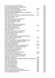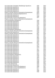 Juniperus virginiana (Baumwacholder) 2025 Chamaecyparis lawsoniana (Scheinzypresse) 2023 Acer saccharinum (Silberahorn) 2018 2024 Platanus x acerifolia (Ahornblättrige Platane) 2023 2024 Acer pseudoplatanus (Bergahorn) 2019 Platycladus orientalis (Morgenländischer Lebensbaum) 2017 2020 Pinus spec. (Kiefer, Föhre) 2019 Carpinus betulus 'Frans Fontaine' (Schlanke Säulenhainbuche) 2019 2025 Picea abies (Gemeine Fichte) 2021 Ulmus spec. (Ulme) 2019 Pinus nigra (Schwarzkiefer, Schwarzföhre) 2024 Picea omorika (Serbische Fichte) 2023 Picea omorika (Serbische Fichte) 2023 Abies spec. (Tanne) 2019 Cedrus atlantica 'Glauca' (Blaue Atlaszeder) 2021 Acer campestre 'Elsrijk' (Feldahorn) 2020 2021 Picea abies (Gemeine Fichte) 2023 Picea omorika (Serbische Fichte) 2023 Picea spec. (Fichte) 2019 Pinus nigra (Schwarzkiefer, Schwarzföhre) 2020 2023 Chamaecyparis spec. (Scheinzypresse) 2019 Thuja spec. (Lebensbaum) 2019 Thuja spec. (Lebensbaum) 2019 Prunus serrulata 'Kanzan' (Japanische Blütenkirsche) 2025 Prunus x yedoensis (Tokyokirsche) 2018 2021 Prunus spec. (Kirsche) 2019 Prunus serrulata 'Kanzan' (Japanische Blütenkirsche) 2023 Platanus x acerifolia (Ahornblättrige Platane) 1969 2023 Prunus padus (Traubenkirsche) 2023 Betula pendula (Weißbirke) 2020 2021 Fagus sylvatica 'Rohan Obelisk' (Säulenblutbuche) 2017 2019 Acer pseudoplatanus 'Leopoldii' (Bergahorn) 2023 Prunus x yedoensis (Tokyokirsche) 2019 2021 Larix decidua (Europäische Lärche) 2022 Acer negundo (Eschenahorn) 2019 Acer negundo 'Sensation' (Eschen-Ahorn) 2019 2023 Prunus x yedoensis (Tokyokirsche) 2019 2025 Juniperus chinensis (Chinesischer Wacholder) 2023 Fagus sylvatica 'Atropurpurea' (Blutbuche) 2022 Malus spec. (Apfelbaum) 1995 2022 Liquidambar styraciflua 'Worplesdon' (Worplesdon-Amberbaum) 2023 2023 Malus spec. (Apfelbaum) 2001 2019 Tilia cordata (Winterlinde) 1970 2022 Tilia cordata (Winterlinde) 1938 2025 Tilia cordata (Winterlinde) 1931 2024 Malus spec. (Apfelbaum) 1995 2023 Tilia cordata (Winterlinde) 1967 2023 Prunus avium (Vogelkirsche) 1994 2025 Sambucus nigra (Schwarzer Holunder) 2001 2019 Prunus serrulata 'Kanzan' (Japanische Blütenkirsche) 1993 2024 Acer platanoides (Spitzahorn) 1951 2024
