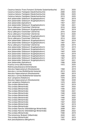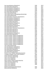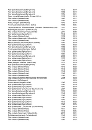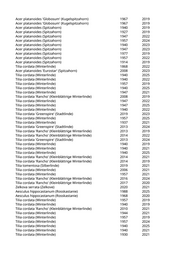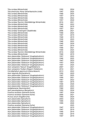 Acer pseudoplatanus (Bergahorn) 1940 2019 Acer platanoides (Spitzahorn) 1947 2021 Acer pseudoplatanus (Bergahorn) 1940 2021 Acer pseudoplatanus (Bergahorn) 1940 2024 Acer pseudoplatanus (Bergahorn) 1940 2024 Acer platanoides (Spitzahorn) 1912 2024 Tilia cordata (Winterlinde) 1860 2025 Tilia cordata 'Rancho' (Kleinblättrige Winterlinde) 2010 2023 Tilia cordata (Winterlinde) 1947 2019 Acer platanoides 'Columnare' (Säulenahorn) 2016 2019 Acer pseudoplatanus (Bergahorn) 1947 2021 Acer pseudoplatanus (Bergahorn) 1947 2020 Acer pseudoplatanus (Bergahorn) 1947 2019 Acer platanoides (Spitzahorn) 1909 2021 Acer pseudoplatanus (Bergahorn) 1894 2019 Acer platanoides (Spitzahorn) 1940 2025 Acer pseudoplatanus (Bergahorn) 1890 2019 Acer platanoides (Spitzahorn) 1957 2021 Acer platanoides 'Columnare' (Säulenahorn) 2005 2024 Acer platanoides (Spitzahorn) 1947 2019 Acer platanoides (Spitzahorn) 1940 2023 Acer platanoides (Spitzahorn) 1940 2021 Acer pseudoplatanus (Bergahorn) 1923 2019 Acer platanoides (Spitzahorn) 1908 2025 Fraxinus excelsior 'Globosa' (Kugelesche) 1967 2021 Fraxinus excelsior 'Globosa' (Kugelesche) 1957 2022 Fraxinus excelsior 'Globosa' (Kugelesche) 1940 2025 Fraxinus excelsior 'Globosa' (Kugelesche) 1947 2024 Fraxinus excelsior 'Globosa' (Kugelesche) 1947 2019 Fraxinus excelsior 'Globosa' (Kugelesche) 1947 2024 Fraxinus excelsior 'Globosa' (Kugelesche) 1940 2025 Fraxinus excelsior 'Globosa' (Kugelesche) 2005 2020 Tilia cordata (Winterlinde) 1874 2025 Acer pseudoplatanus (Bergahorn) 1957 2025 Acer pseudoplatanus (Bergahorn) 1940 2021 Acer platanoides (Spitzahorn) 1947 2019 Acer pseudoplatanus (Bergahorn) 2005 2025 Acer platanoides (Spitzahorn) 1940 2019 Fraxinus ornus 'Obelisk' (Säulenblumenesche) 2017 2024 Crataegus laevigata 'Pauls Scarlet' (Rotdorn) 1980 2020 Sorbus domestica (Speierling) 2016 2022 Sorbus domestica (Speierling) 2016 2019 Ulmus minor (Feldulme) 1970 2019 Ulmus minor (Feldulme) 1980 2019 Fagus sylvatica 'Dawyk' (Säulenrotbuche) 2019 2022 Sorbus domestica (Speierling) 2016 2021 Ulmus minor (Feldulme) 1980 2019 Ulmus minor (Feldulme) 1980 2019 Ulmus minor (Feldulme) 2019 Robinia pseudoacacia (Scheinakazie) 1960 2025 Betula pendula (Weißbirke) 1947 2024