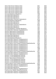 Acer pseudoplatanus 'Leopoldii' (Bergahorn) 1947 2022 Acer pseudoplatanus (Bergahorn) 1940 2019 Pyrus calleryana 'Chanticleer' (Zierbirne) 2020 2023 Acer platanoides 'Columnare' (Säulenahorn) 2015 2024 Acer platanoides (Spitzahorn) 1940 2019 Prunus padus (Traubenkirsche) 2010 2022 Acer platanoides (Spitzahorn) 1950 2024 Sophora japonica (Schnurbaum) 1940 2024 Acer platanoides (Spitzahorn) 1940 2019 Sophora japonica (Schnurbaum) 1940 2024 Acer platanoides (Spitzahorn) 1950 2021 Acer platanoides (Spitzahorn) 1940 2019 Acer pseudoplatanus (Bergahorn) 1947 2021 Acer platanoides 'Columnare' (Säulenahorn) 2011 2023 Acer platanoides 'Globosum' (Kugelspitzahorn) 1967 2024 Pterocarya fraxinifolia (Kaukasische Flügelnuss) 2017 2019 Acer platanoides 'Globosum' (Kugelspitzahorn) 1995 2019 Acer platanoides 'Globosum' (Kugelspitzahorn) 1957 2024 Koelreuteria paniculata 'Fastigiata' (Säulenblasenbaum) 2006 2025 Koelreuteria paniculata 'Fastigiata' (Säulenblasenbaum) 2006 2021 Acer platanoides 'Globosum' (Kugelspitzahorn) 1940 2025 Acer platanoides 'Globosum' (Kugelspitzahorn) 1947 2024 Acer platanoides 'Globosum' (Kugelspitzahorn) 1947 2020 Acer platanoides 'Globosum' (Kugelspitzahorn) 1957 2024 Tilia cordata (Winterlinde) 1940 2021 Malus sylvestris (Holzapfel) 2006 2024 Acer platanoides (Spitzahorn) 1940 2020 Acer pseudoplatanus (Bergahorn) 1960 2024 Acer pseudoplatanus (Bergahorn) 1947 2021 Acer platanoides (Spitzahorn) 1940 2021 Acer pseudoplatanus (Bergahorn) 1950 2020 Acer platanoides 'Columnare' (Säulenahorn) 2016 2023 Acer pseudoplatanus (Bergahorn) 1940 2022 Acer platanoides (Spitzahorn) 1947 2019 Acer pseudoplatanus (Bergahorn) 1940 2023 Acer platanoides (Spitzahorn) 1957 2020 Acer pseudoplatanus (Bergahorn) 1957 2019 Acer platanoides (Spitzahorn) 1957 2021 Acer platanoides (Spitzahorn) 1957 2020 Acer platanoides (Spitzahorn) 1967 2019 Acer platanoides (Spitzahorn) 1967 2020 Acer platanoides (Spitzahorn) 1947 2021 Acer pseudoplatanus 'Purpurascens' (Bergahorn 'Purpurascens') 1940 2025 Acer platanoides 'Globosum' (Kugelspitzahorn) 1957 2020 Acer platanoides 'Globosum' (Kugelspitzahorn) 2004 2021 Acer platanoides (Spitzahorn) 1940 2022 Pyrus calleryana 'Chanticleer' (Zierbirne) 2017 2022 Ulmus 'New Horizon' (Resista Ulme) 2020 2024 Pyrus calleryana 'Chanticleer' (Zierbirne) 2005 2020 Ulmus 'New Horizon' (Resista Ulme) 2021 2022 Pyrus calleryana 'Chanticleer' (Zierbirne) 2008 2021