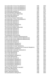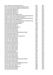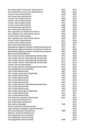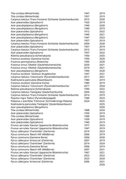 Tilia cordata (Winterlinde) 1947 2019 Tilia cordata (Winterlinde) 1957 2019 Carpinus betulus 'Frans Fontaine' (Schlanke Säulenhainbuche) 2015 2020 Acer platanoides (Spitzahorn) 1920 2019 Acer pseudoplatanus (Bergahorn) 1940 2020 Acer pseudoplatanus (Bergahorn) 1940 2019 Acer platanoides (Spitzahorn) 1912 2022 Acer pseudoplatanus (Bergahorn) 1940 2021 Acer pseudoplatanus (Bergahorn) 1947 2023 Acer platanoides (Spitzahorn) 1957 2019 Carpinus betulus 'Frans Fontaine' (Schlanke Säulenhainbuche) 2004 2020 Acer platanoides (Spitzahorn) 1957 2019 Carpinus betulus 'Frans Fontaine' (Schlanke Säulenhainbuche) 2015 2019 Acer platanoides (Spitzahorn) 1957 2022 Robinia pseudoacacia (Scheinakazie) 1950 2025 Fraxinus excelsior (Gemeine Esche) 1950 2020 Fraxinus pennsylvanica (Rotesche) 1995 2020 Fraxinus ornus 'Obelisk' (Säulenblumenesche) 2020 2021 Fraxinus ornus 'Obelisk' (Säulenblumenesche) 2019 2021 Acer pseudoplatanus (Bergahorn) 1990 2020 Fraxinus excelsior 'Globosa' (Kugelesche) 1947 2021 Carpinus betulus 'Columnaris' (Pyramidenhainbuche) 2017 2021 Koelreuteria paniculata (Blasenbaum) 1980 2019 Fraxinus excelsior (Gemeine Esche) 1980 2019 Carpinus betulus 'Columnaris' (Pyramidenhainbuche) 2017 2024 Robinia pseudoacacia (Scheinakazie) 1990 2022 Carpinus betulus 'Fastigiata' (Säulenhainbuche) 2004 2022 Carpinus betulus 'Frans Fontaine' (Schlanke Säulenhainbuche) 2014 2019 Populus nigra 'Italica' (Pyramidenpappel) 1940 2023 Platanus x acerifolia 'Tremonia' (Schmalkronige Platane) 2024 2025 Koelreuteria paniculata 'Fastigiata' (Säulenblasenbaum) 2025 Acer pseudoplatanus (Bergahorn) 2020 Tilia cordata (Winterlinde) 1888 2024 Acer platanoides (Spitzahorn) 1930 2019 Tilia cordata (Winterlinde) 1940 2025 Acer platanoides (Spitzahorn) 1930 2019 Acer platanoides (Spitzahorn) 1940 2019 Prunus serrulata 'Kanzan' (Japanische Blütenkirsche) 1977 2023 Prunus serrulata 'Kanzan' (Japanische Blütenkirsche) 1947 2019 Pyrus calleryana 'Chanticleer' (Zierbirne) 2019 2023 Pyrus communis 'Beech Hill' (Wildbirne) 2006 2019 Pyrus communis (Gemeine Birne) 2004 2020 Pyrus calleryana 'Aristocrat' (Zierbirne) 2007 2019 Pyrus calleryana 'Chanticleer' (Zierbirne) 2014 2024 Pyrus communis (Gemeine Birne) 2006 2019 Pyrus communis 'Beech Hill' (Wildbirne) 2007 2021 Prunus serrulata 'Kanzan' (Japanische Blütenkirsche) 1967 2021 Pyrus calleryana 'Chanticleer' (Zierbirne) 2022 2022 Pyrus calleryana 'Chanticleer' (Zierbirne) 2023 2024 Pyrus calleryana 'Aristocrat' (Zierbirne) 2006 2021 2020