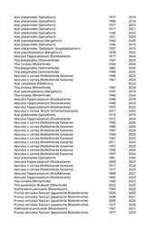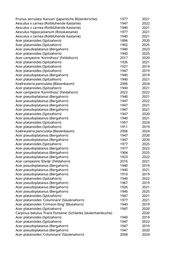 Acer platanoides (Spitzahorn) 1977 2019 Acer platanoides (Spitzahorn) 1900 2019 Acer platanoides (Spitzahorn) 1977 2023 Acer platanoides (Spitzahorn) 1917 2021 Acer platanoides (Spitzahorn) 1940 2022 Acer platanoides (Spitzahorn) 1921 2024 Acer pseudoplatanus (Bergahorn) 1940 2020 Acer platanoides (Spitzahorn) 1940 2019 Acer platanoides 'Globosum' (Kugelspitzahorn) 1957 2019 Acer pseudoplatanus (Bergahorn) 1878 2022 Aesculus hippocastanum (Rosskastanie) 1877 2024 Tilia platyphyllos (Sommerlinde) 1947 2023 Tilia cordata (Winterlinde) 1940 2020 Tilia platyphyllos (Sommerlinde) 1882 2020 Tilia platyphyllos (Sommerlinde) 1940 2025 Aesculus x carnea (Rotblühende Kastanie) 1996 2025 Aesculus x carnea (Rotblühende Kastanie) 1967 2024 Acer campestre (Feldahorn) 2023 Tilia cordata (Winterlinde) 1947 2024 Acer pseudoplatanus (Bergahorn) 1947 2019 Tilia cordata (Winterlinde) 1940 2024 Aesculus hippocastanum (Rosskastanie) 1940 2019 Aesculus hippocastanum (Rosskastanie) 1940 2023 Aesculus hippocastanum (Rosskastanie) 1957 2025 Aesculus x carnea 'Briotii' (Scharlachkastanie) 2017 2025 Acer platanoides (Spitzahorn) 1919 2019 Aesculus hippocastanum (Rosskastanie) 1912 2024 Aesculus x carnea (Rotblühende Kastanie) 1940 2020 Aesculus x carnea (Rotblühende Kastanie) 1940 2024 Aesculus x carnea (Rotblühende Kastanie) 1947 2024 Aesculus x carnea (Rotblühende Kastanie) 1940 2024 Aesculus x carnea (Rotblühende Kastanie) 1947 2023 Aesculus x carnea (Rotblühende Kastanie) 2011 2024 Aesculus x carnea (Rotblühende Kastanie) 1957 2023 Aesculus x carnea (Rotblühende Kastanie) 1940 2024 Aesculus x carnea (Rotblühende Kastanie) 1957 2024 Acer platanoides (Spitzahorn) 1881 2020 Aesculus hippocastanum (Rosskastanie) 2003 2023 Aesculus x carnea (Rotblühende Kastanie) 2017 2024 Aesculus x carnea (Rotblühende Kastanie) 1977 2023 Aesculus hippocastanum (Rosskastanie) 1849 2021 Aesculus hippocastanum (Rosskastanie) 1865 2023 Tilia cordata (Winterlinde) 1940 2023 Tilia tomentosa 'Brabant' (Silberlinde) 2023 2025 Koelreuteria paniculata (Blasenbaum) 1947 2020 Prunus serrulata 'Kanzan' (Japanische Blütenkirsche) 2020 2020 Prunus serrulata 'Kanzan' (Japanische Blütenkirsche) 2008 2021 Prunus serrulata 'Kanzan' (Japanische Blütenkirsche) 2006 2024 Prunus serrulata 'Kanzan' (Japanische Blütenkirsche) 1977 2020 Koelreuteria paniculata (Blasenbaum) 1947 2021 Prunus serrulata 'Kanzan' (Japanische Blütenkirsche) 1977 2025
