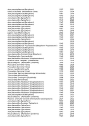 Acer pseudoplatanus (Bergahorn) 1957 2021 Ulmus 'Columella' (Holländische Ulme) 2021 2024 Acer pseudoplatanus (Bergahorn) 1947 2019 Acer pseudoplatanus (Bergahorn) 1940 2020 Acer platanoides (Spitzahorn) 1947 2019 Acer platanoides (Spitzahorn) 1947 2020 Acer pseudoplatanus (Bergahorn) 1947 2022 Acer pseudoplatanus (Bergahorn) 1940 2019 Acer platanoides (Spitzahorn) 1888 2019 Acer platanoides (Spitzahorn) 1957 2023 Acer platanoides (Spitzahorn) 1940 2019 Juglans regia (Walnussbaum) 2002 2025 Acer pseudoplatanus (Bergahorn) 1924 2021 Acer pseudoplatanus (Bergahorn) 1940 2021 Acer platanoides (Spitzahorn) 1940 2024 Acer pseudoplatanus (Bergahorn) 2019 Acer pseudoplatanus (Bergahorn) 1940 2020 Acer pseudoplatanus 'Purpurascens' (Bergahorn 'Purpurascens') 1940 2022 Acer pseudoplatanus (Bergahorn) 1940 2025 Acer pseudoplatanus (Bergahorn) 1995 2019 Acer pseudoplatanus (Bergahorn) 1957 2021 Acer platanoides 'Crimson King' (Blutahorn) 1940 2019 Tilia platyphyllos (Sommerlinde) 1940 2023 Acer platanoides 'Globosum' (Kugelspitzahorn) 1957 2019 Quercus robur 'Fastigiata' (Säuleneiche) 1970 2019 Pyrus calleryana 'Chanticleer' (Zierbirne) 2019 2025 Picea abies (Gemeine Fichte) 1960 2025 Picea abies (Gemeine Fichte) 1980 2025 Cornus mas (Dirndlstrauch) 1980 2020 Picea abies (Gemeine Fichte) 1970 2025 Tilia cordata 'Rancho' (Kleinblättrige Winterlinde) 2012 2020 Tilia cordata (Winterlinde) 1950 2024 Tilia cordata 'Greenspire' (Stadtlinde) 2008 2024 Tilia cordata (Winterlinde) 1950 2022 Acer platanoides 'Globosum' (Kugelspitzahorn) 1947 2019 Acer platanoides 'Globosum' (Kugelspitzahorn) 1957 2019 Acer platanoides 'Globosum' (Kugelspitzahorn) 1957 2025 Acer platanoides 'Globosum' (Kugelspitzahorn) 1940 2021 Acer platanoides 'Globosum' (Kugelspitzahorn) 1940 2021 Acer platanoides 'Globosum' (Kugelspitzahorn) 1940 2024 Acer pseudoplatanus (Bergahorn) 1960 2022 Pyrus calleryana 'Chanticleer' (Zierbirne) 2019 2021 Platanus orientalis 'Minaret' (Orientalische Säulenplatane) 2021 2022 Acer platanoides (Spitzahorn) 1977 2020 Acer platanoides 'Eurostar' (Spitzahorn) 2006 2025 Acer platanoides (Spitzahorn) 1957 2019 Acer platanoides (Spitzahorn) 1940 2020 Acer platanoides (Spitzahorn) 1940 2020 Acer platanoides (Spitzahorn) 1947 2019 Pyrus calleryana 'Chanticleer' (Zierbirne) 2017 2019 Acer platanoides (Spitzahorn) 1924 2025